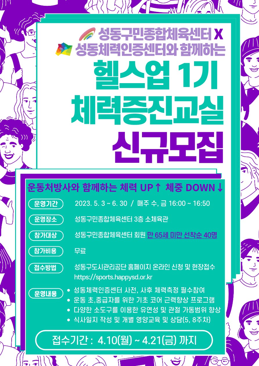[성동구민종합체육센터] 헬스업1기 체력증진교실 신규모집 안내 작성자 관리자 등록일자 2023년 4월 7일 13시 39분 44초 조회 1,653 기타 궁금하신 점은 02-2204-7600으로 연락주시기 바랍니다. 헬스업1기-체력증진교실-모집(4.6최종본)_1.jpg [ Size : 321.34KB , Down : 1,955 ] 미리보기 다운로드 목록보기