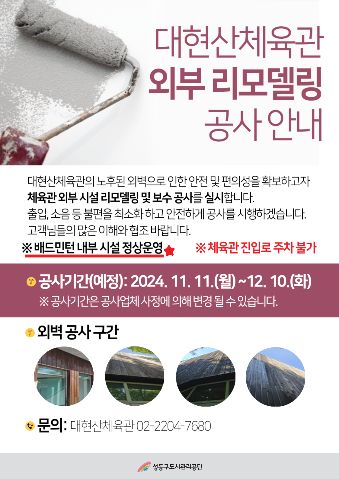 [대현산체육관] 외부 리모델링 공사 안내 작성자 관리자 등록일자 2024년 10월 28일 10시 31분 5초 조회 536 대현산체육관의 노후된 외벽을 다음과 같이 리모델링 및 보수 공사를 실시하오니내용확인하시고 고객님들의 많은 이해와 협조 바랍니다.※ 배드민턴 내부시설 정상운영※ 체육관 진입로 주차불가 대현산체육관 리모델링 공사안내-002.png [ Size : 781.79KB , Down : 394 ] 미리보기 다운로드 목록보기