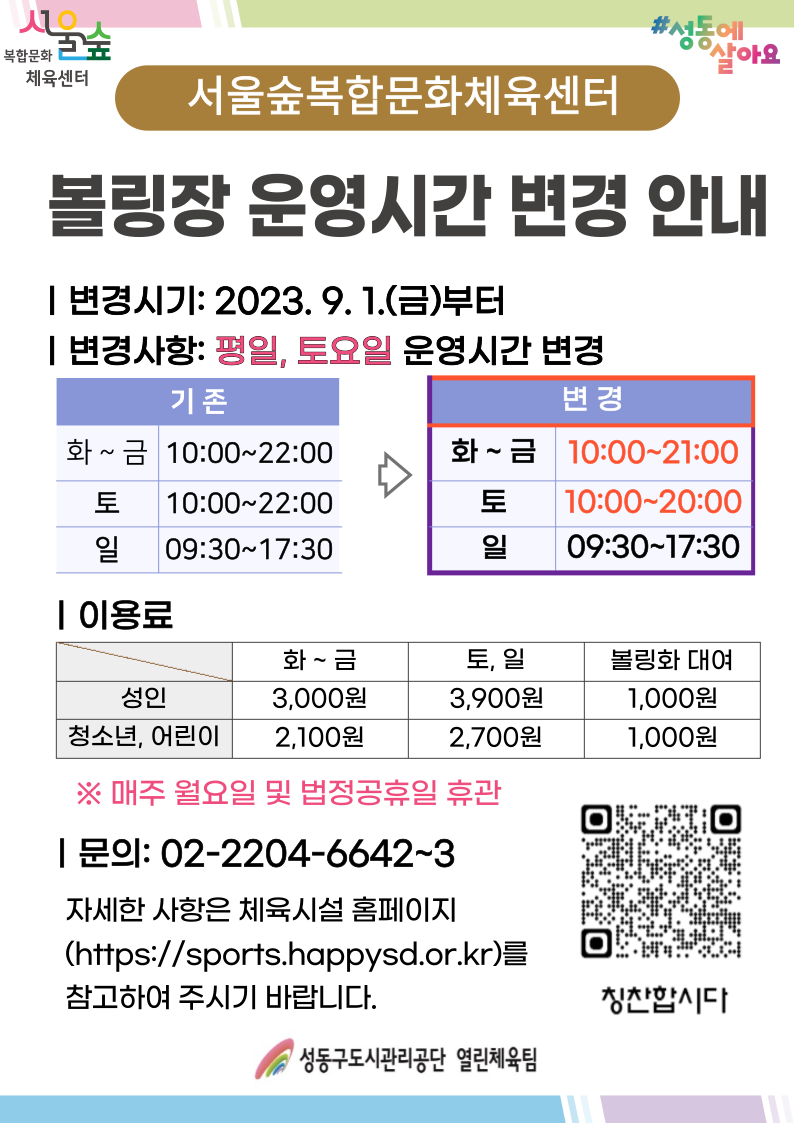 [서울숲복합문화체육센터] 볼링장 운영시간 변경 안내 작성자 관리자 등록일자 2023년 8월 9일 15시 36분 2초 조회 611 서울숲복합문화체육센터 볼링장 운영시간 변경 안내.png [ Size : 255.41KB , Down : 1,200 ] 미리보기 다운로드 목록보기