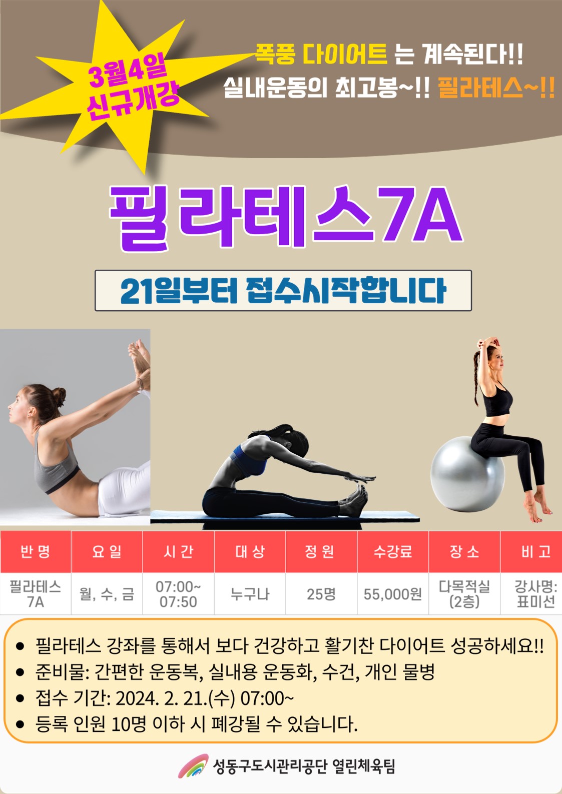[금호스포츠센터] 필라테스 신규강좌 개설 안내 작성자 관리자 등록일자 2024년 2월 15일 13시 18분 55초 조회 779 ▶ 수강신청하러가기!(클릭) 필라테스 안내문.JPG [ Size : 259.81KB , Down : 635 ] 미리보기 다운로드 목록보기