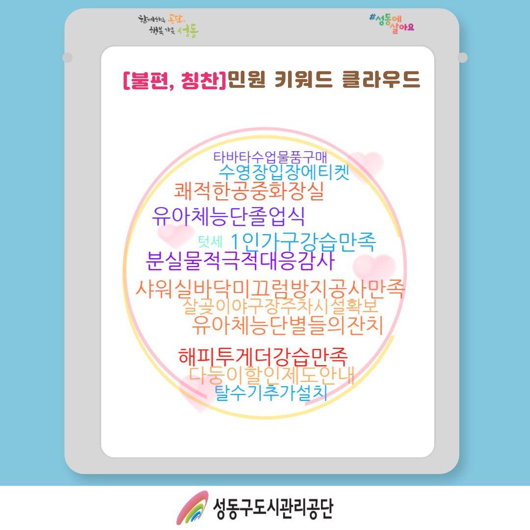 민원 키워드 클라우드 작성자 관리자 등록일자 2024년 5월 3일 11시 56분 33초 조회 506 1인가구 강습만족수영장 에티켓 키워드클라우스-수정.png [ Size : 211.13KB , Down : 334 ] 미리보기 다운로드 목록보기
