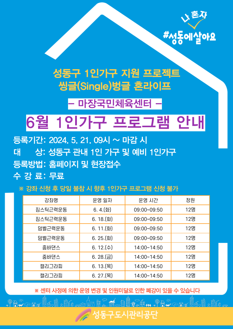 마장국민체육센터 6월 1인가구 혼라이프 무료 프로그램 안내 작성자 관리자 등록일자 2024년 5월 2일 10시 21분 7초 조회 558 6월 1인가구 안내문.png [ Size : 204.27KB , Down : 420 ] 미리보기 다운로드 목록보기