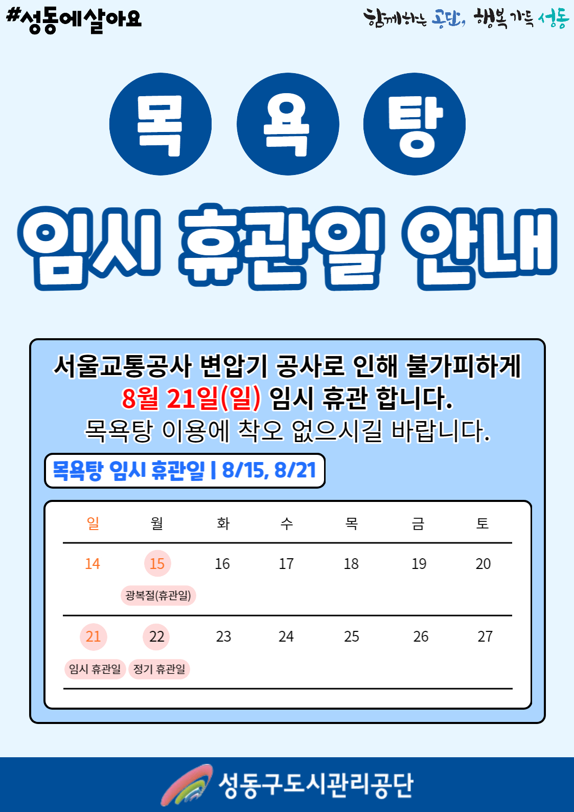 [용답체육센터] 목욕탕 임시 휴관일 안내 작성자 관리자 등록일자 2022년 8월 4일 10시 13분 22초 조회 904 목욕탕 임시 휴관일 안내.jpg [ Size : 625.07KB , Down : 413 ] 미리보기 다운로드 목록보기