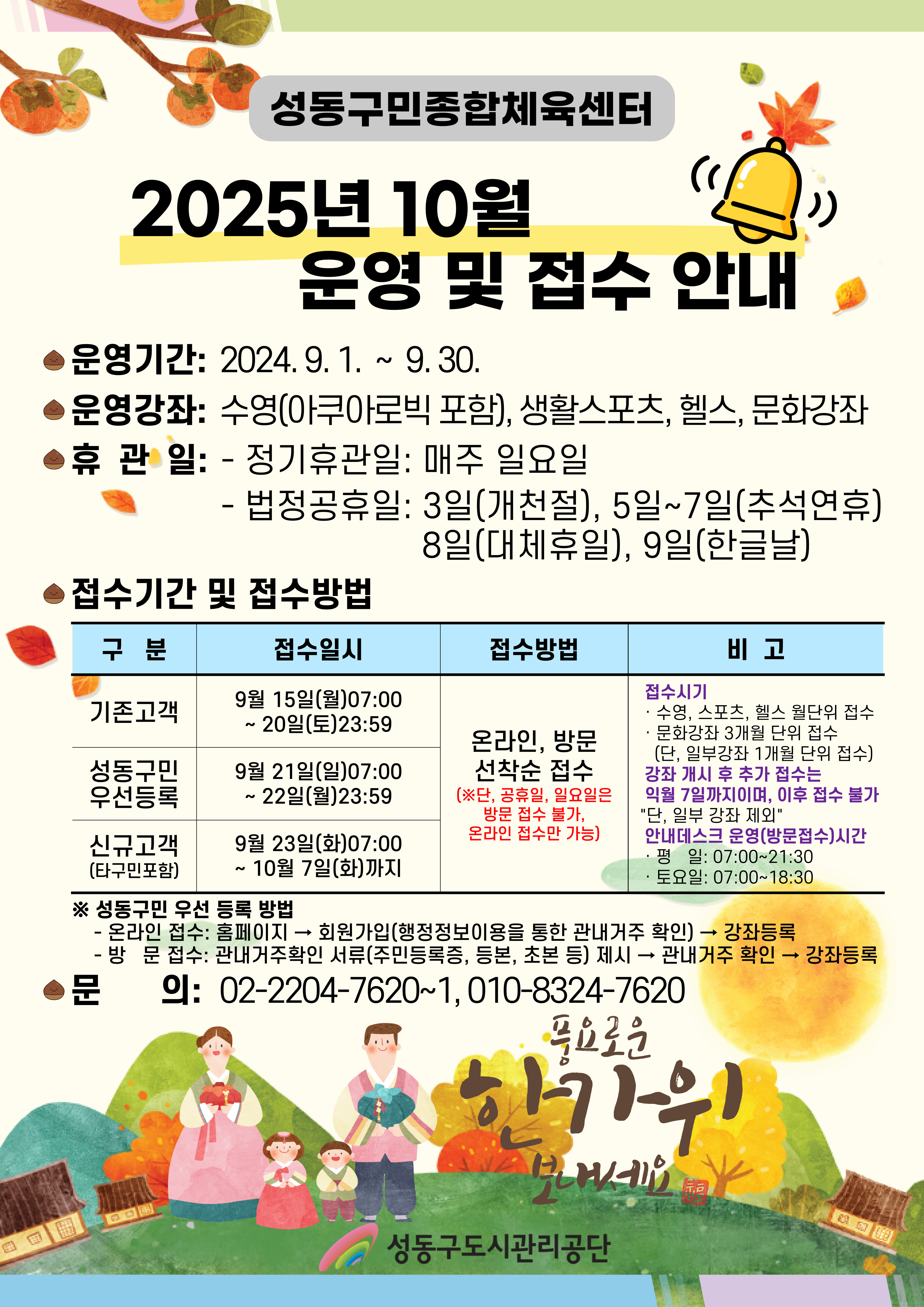 [성동구민종합체육센터] 10월 운영 및 접수 안내 작성자 관리자 등록일자 2025년 9월 16일 15시 22분 31초 조회 603 ○ 접수기간 - [재등록 고객] 8. 15.(금) 07:00 ~ 20.(수) 23:59 ※ 단, 법정공휴일, 일요일은 온라인접수만 가능 - [신규등록-성동구민 우선 등록 고객] 8. 21.(목) 07:00 ~ 22.(금) 23:59 - [신규등록-일반등록(타구민 포함) 고객] 8. 23.(토) 07:00 ~ 9. 7.(일) 선착순 접수 운영-및-접수안내_복사본-001 (1).jpg [ Size : 2.37MB , Down : 104 ] 미리보기 다운로드 목록보기
