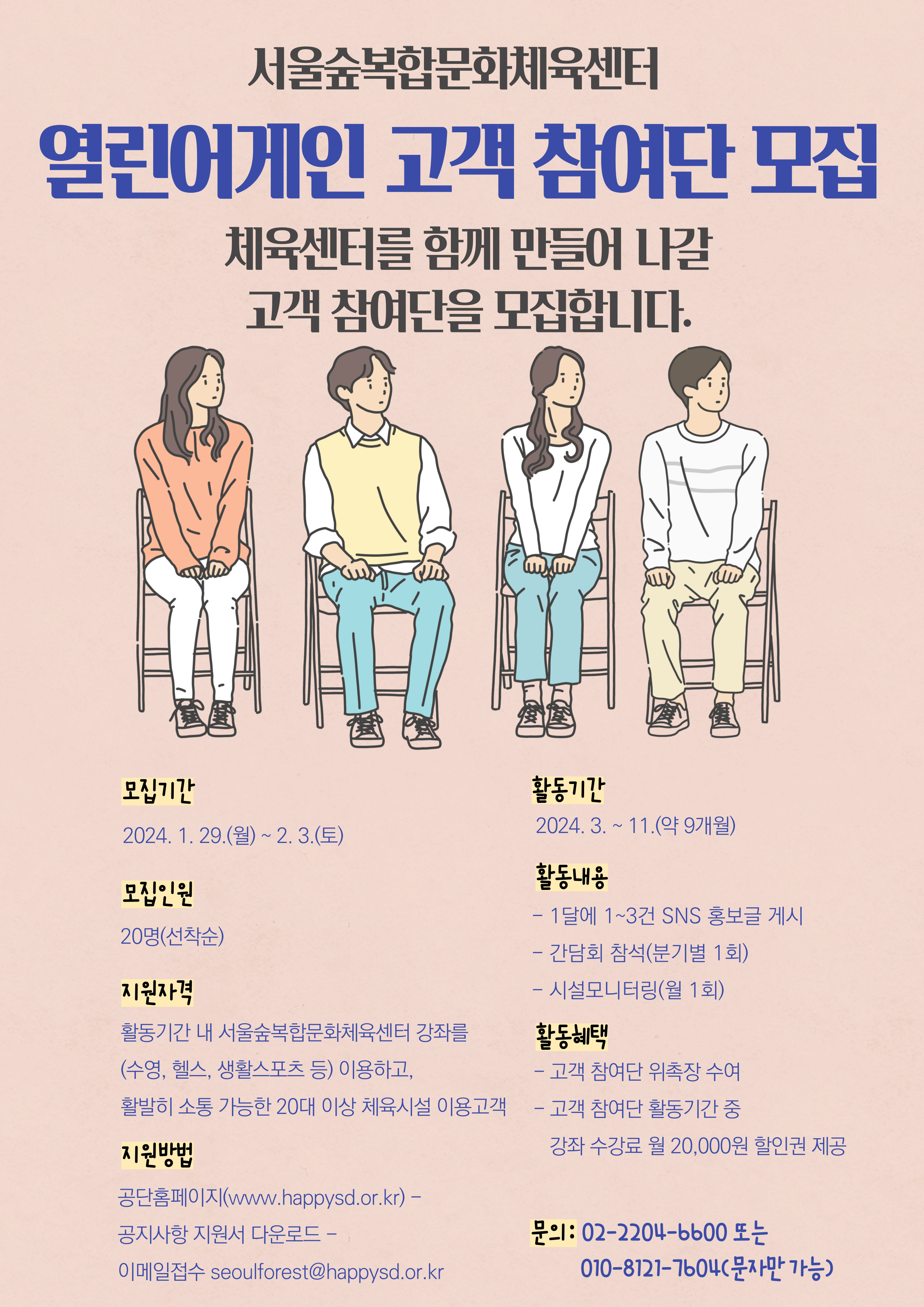 [모집 완료] 서울숲복합문화체육센터 '열린어게인 고객참여단' 모집 안내 작성자 관리자 등록일자 2024년 1월 26일 15시 37분 38초 조회 925 서울숲복합문화체육센터 '열린어게인 고객참여단' 안내문.jpg [ Size : 1.71MB , Down : 867 ] 미리보기 다운로드 붙임1. 열린어게인 고객참여단 지원서(서울숲).hwp [ Size : 24.5KB , Down : 544 ] 다운로드 목록보기
