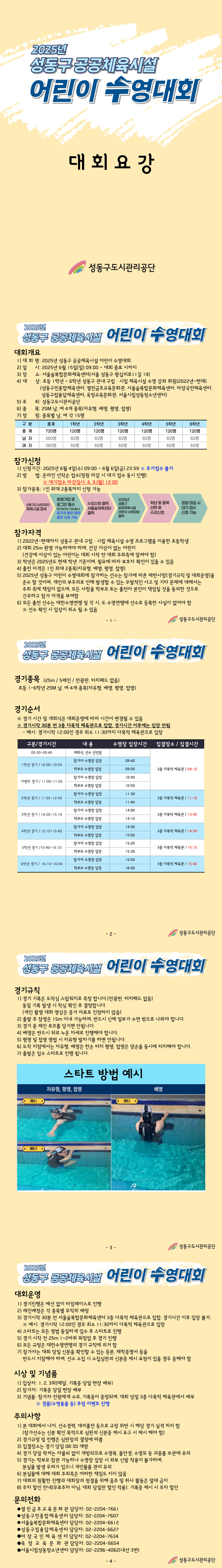 [2025년 성동구 공공체육시설 어린이 수영대회] 대회요강 작성자 관리자 등록일자 2025년 5월 28일 11시 52분 48초 조회 4,315 ▶ 접수하러가기※ 대기접수는 6월 9일 12:00까지 입니다.▶ 접수하러가기 [2025년 성동구 공공체육시설 어린이 수영대회] 25수영대회-대회요강.jpg [ Size : 1.93MB , Down : 1,789 ] 미리보기 다운로드 25수영대회-대회요강.pdf [ Size : 4.38MB , Down : 455 ] 다운로드 목록보기