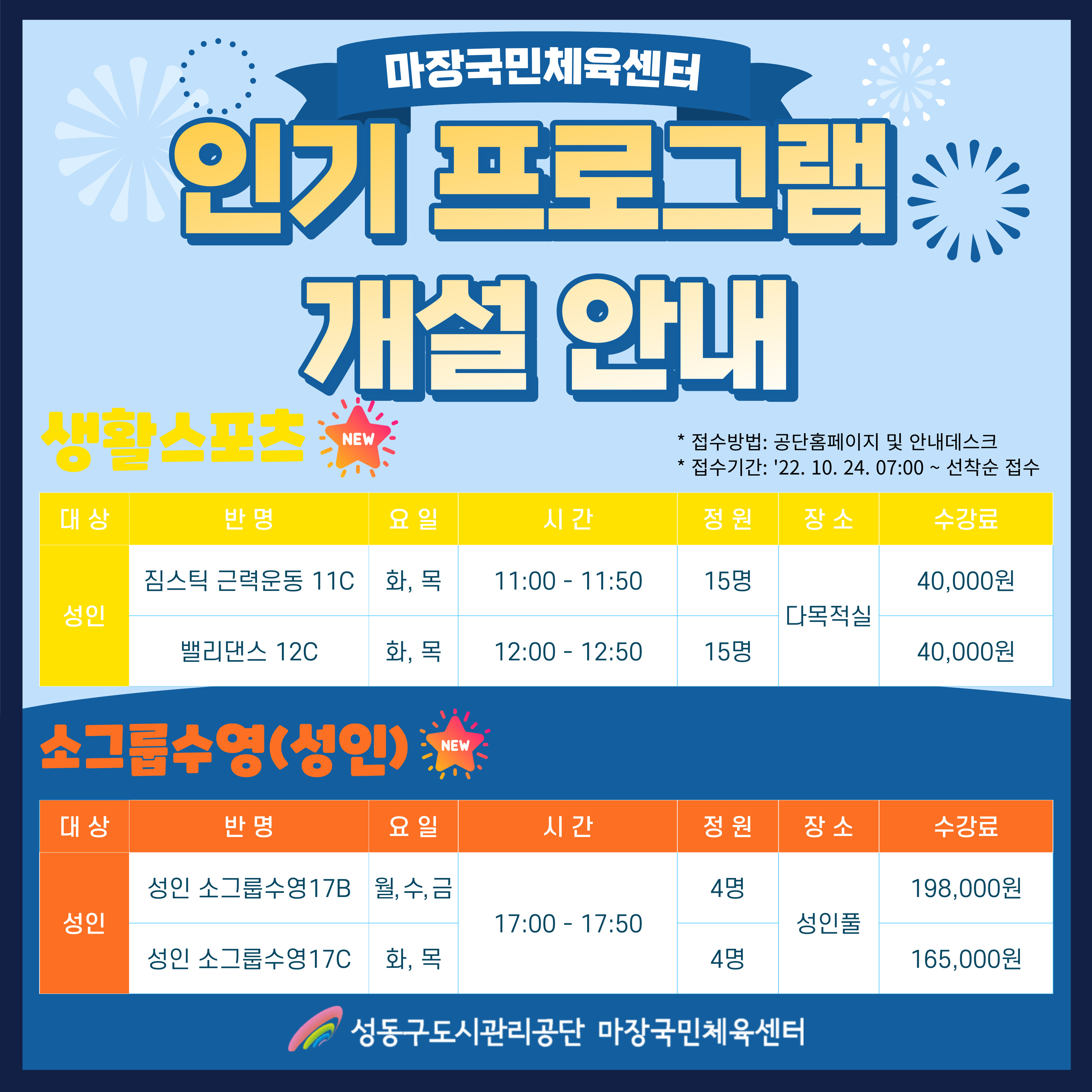 [마장국민체육센터] 11월 인기강좌 신규개설 안내 작성자 관리자 등록일자 2022년 10월 24일 16시 43분 29초 조회 891 최종-001 (2).jpg [ Size : 1.11MB , Down : 437 ] 미리보기 다운로드 목록보기
