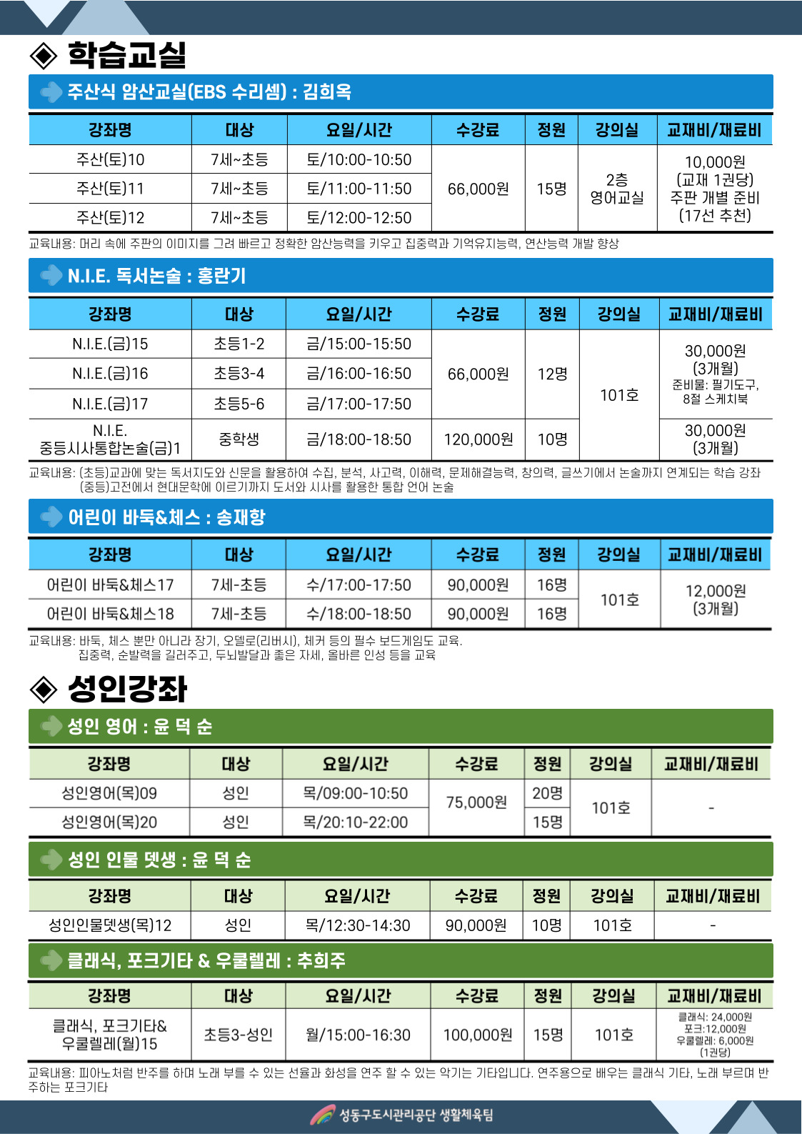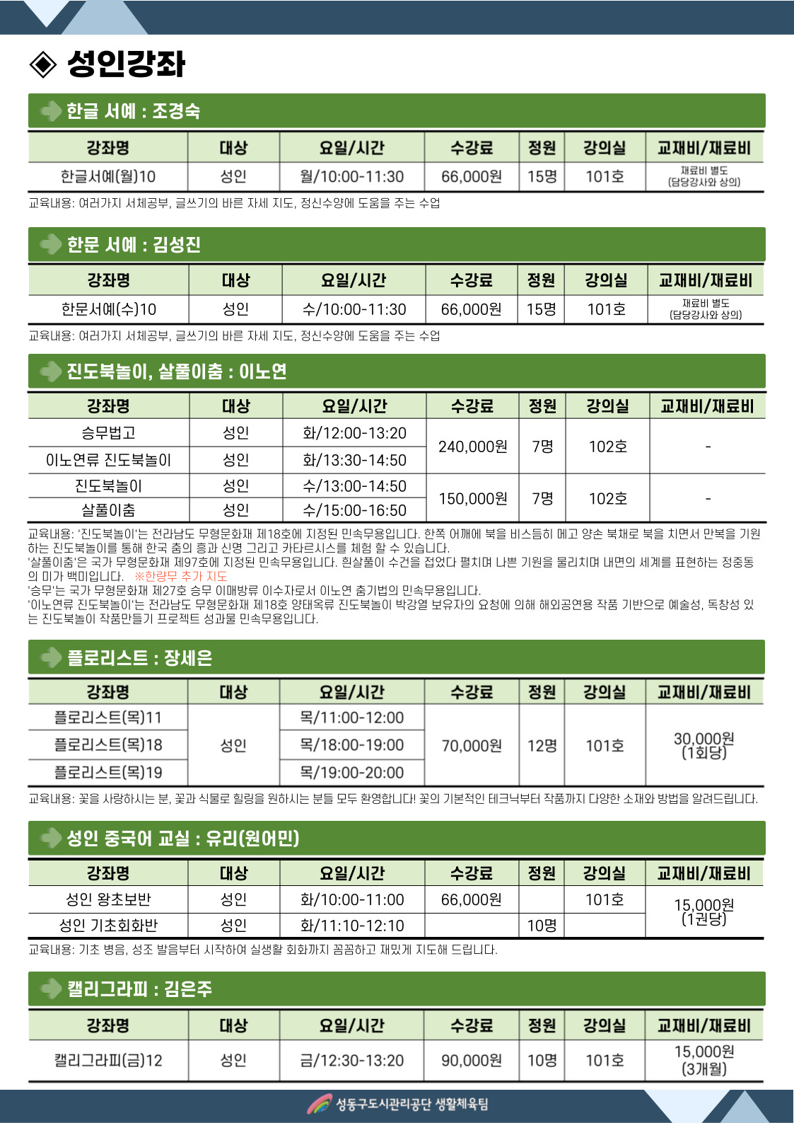 성동구민종합체육센터 제106기 봄학기 문화강좌 안내 작성자 관리자 등록일자 2023년 2월 13일 12시 20분 27초 조회 1,233 002.jpg [ Size : 446.32KB , Down : 1,002 ] 미리보기 다운로드 003.jpg [ Size : 410.55KB , Down : 972 ] 미리보기 다운로드 004.jpg [ Size : 457.95KB , Down : 1,023 ] 미리보기 다운로드 목록보기