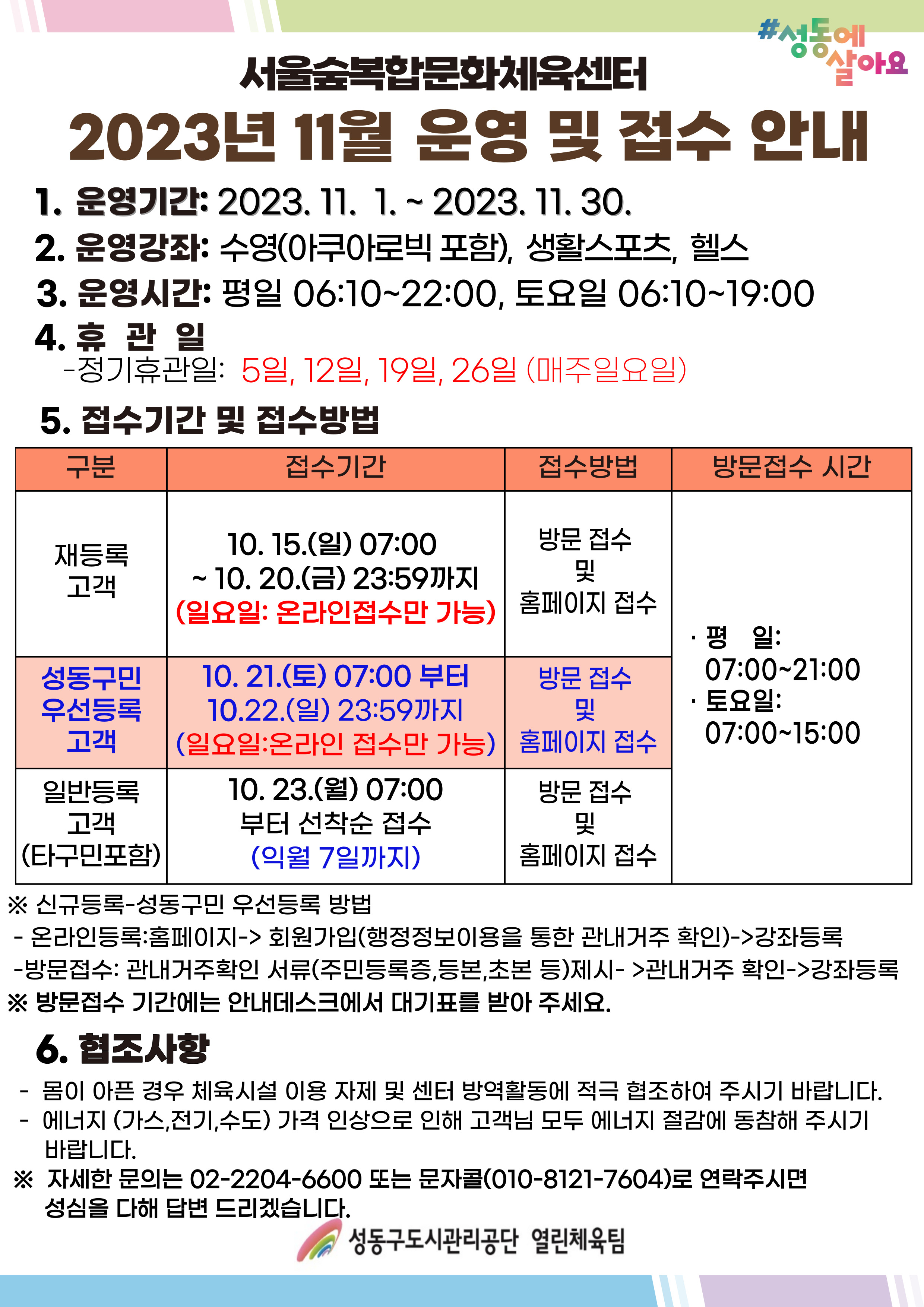 서울숲복합문화체육센터 11월 운영 및 접수 안내문 작성자 관리자 등록일자 2023년 10월 13일 16시 36분 23초 조회 916 11월 강좌 재등록 및 휴관 안내문.jpg [ Size : 1.17MB , Down : 4,137 ] 미리보기 다운로드 목록보기