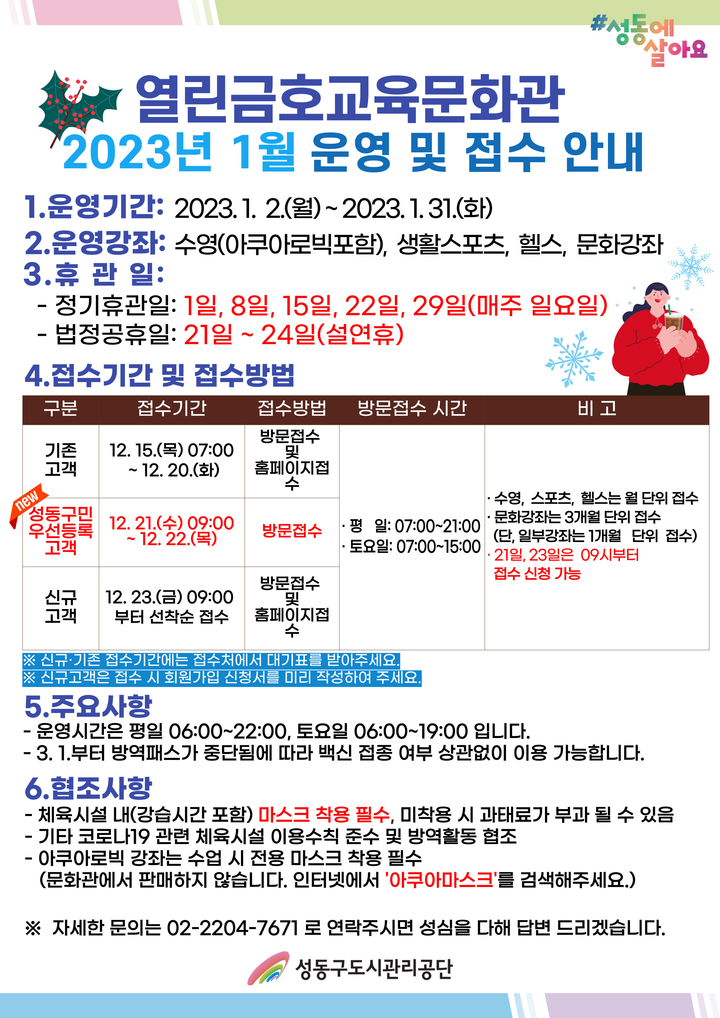 [열린금호교육문화관] 2023년 1월 강좌 운영 및 접수 안내 작성자 관리자 등록일자 2022년 12월 12일 10시 26분 8초 조회 1,166 ▶ 열린금호교육문화관 2022년 1월 수강신청 바로가기 열린금호교육문화관.jpg [ Size : 1.31MB , Down : 721 ] 미리보기 다운로드 목록보기