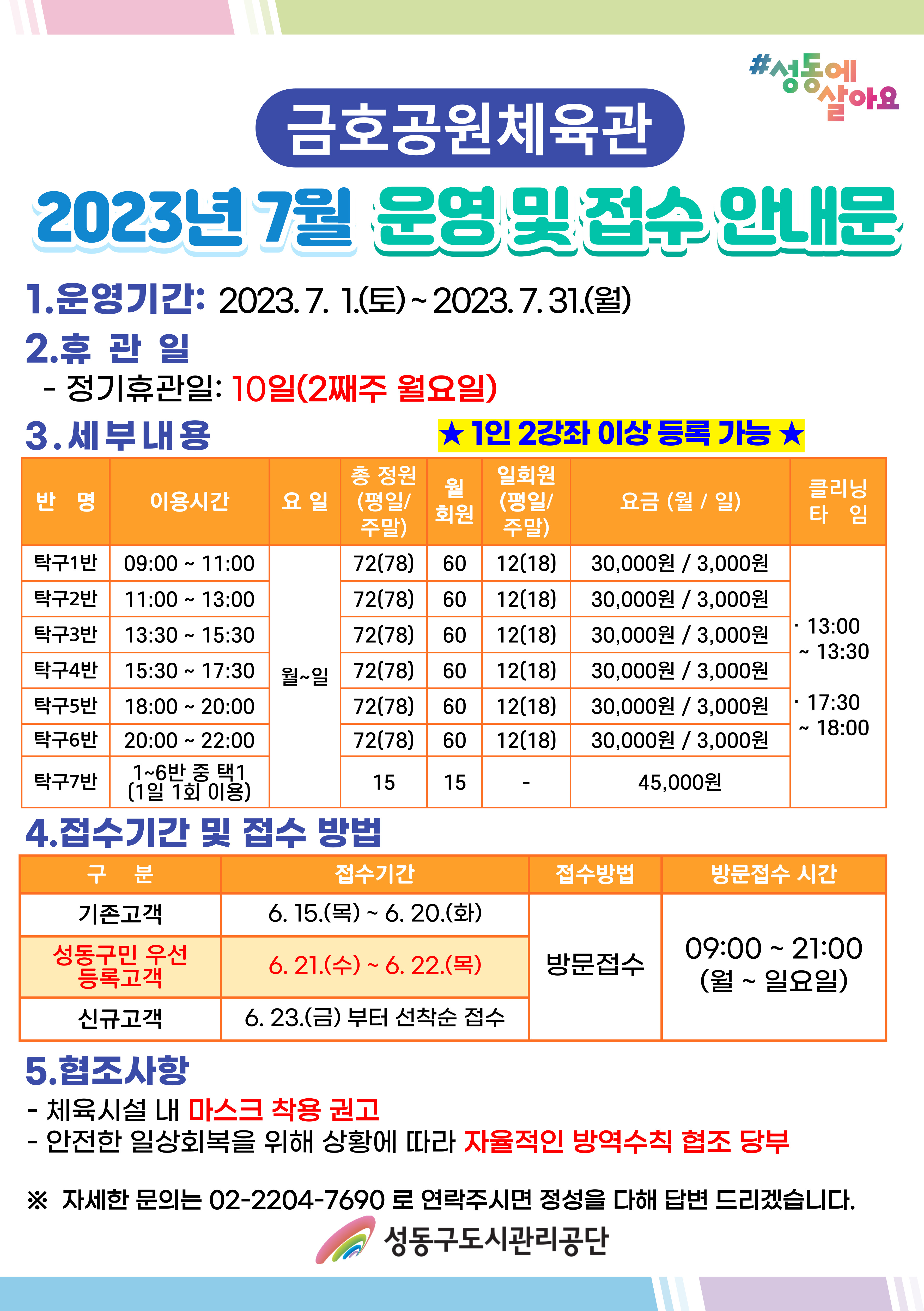 [금호공원체육관] 7월 운영 및 접수 안내문 작성자 관리자 등록일자 2023년 6월 8일 11시 20분 25초 조회 551 금호공원체육관.jpg [ Size : 1.96MB , Down : 278 ] 미리보기 다운로드 목록보기
