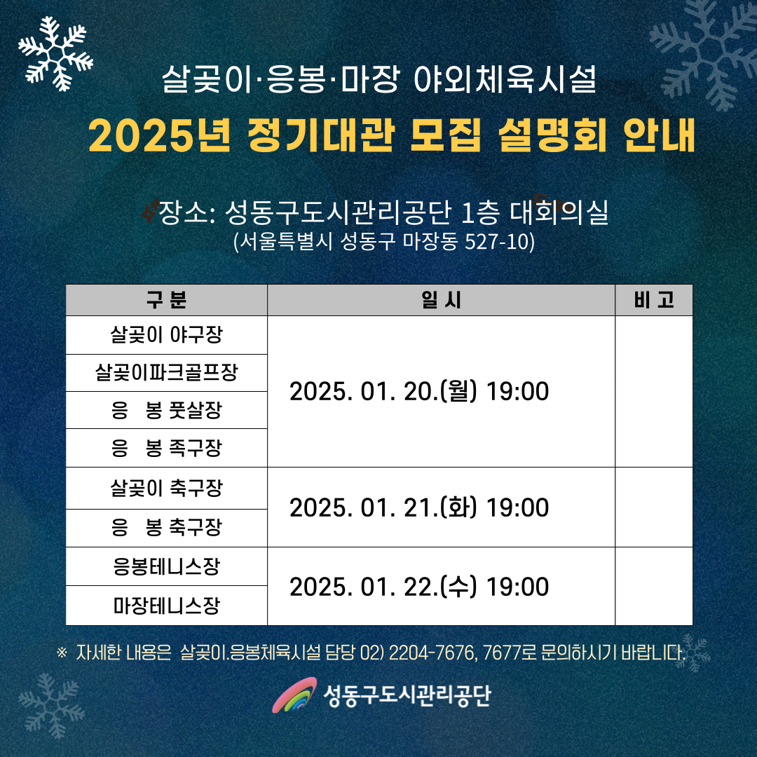 2025년 살곶이.응봉야외체육시설 정기대관 설명회 일정 안내 작성자 관리자 등록일자 2025년 1월 7일 15시 4분 57초 조회 526 설명회.png [ Size : 1.29MB , Down : 384 ] 미리보기 다운로드 목록보기