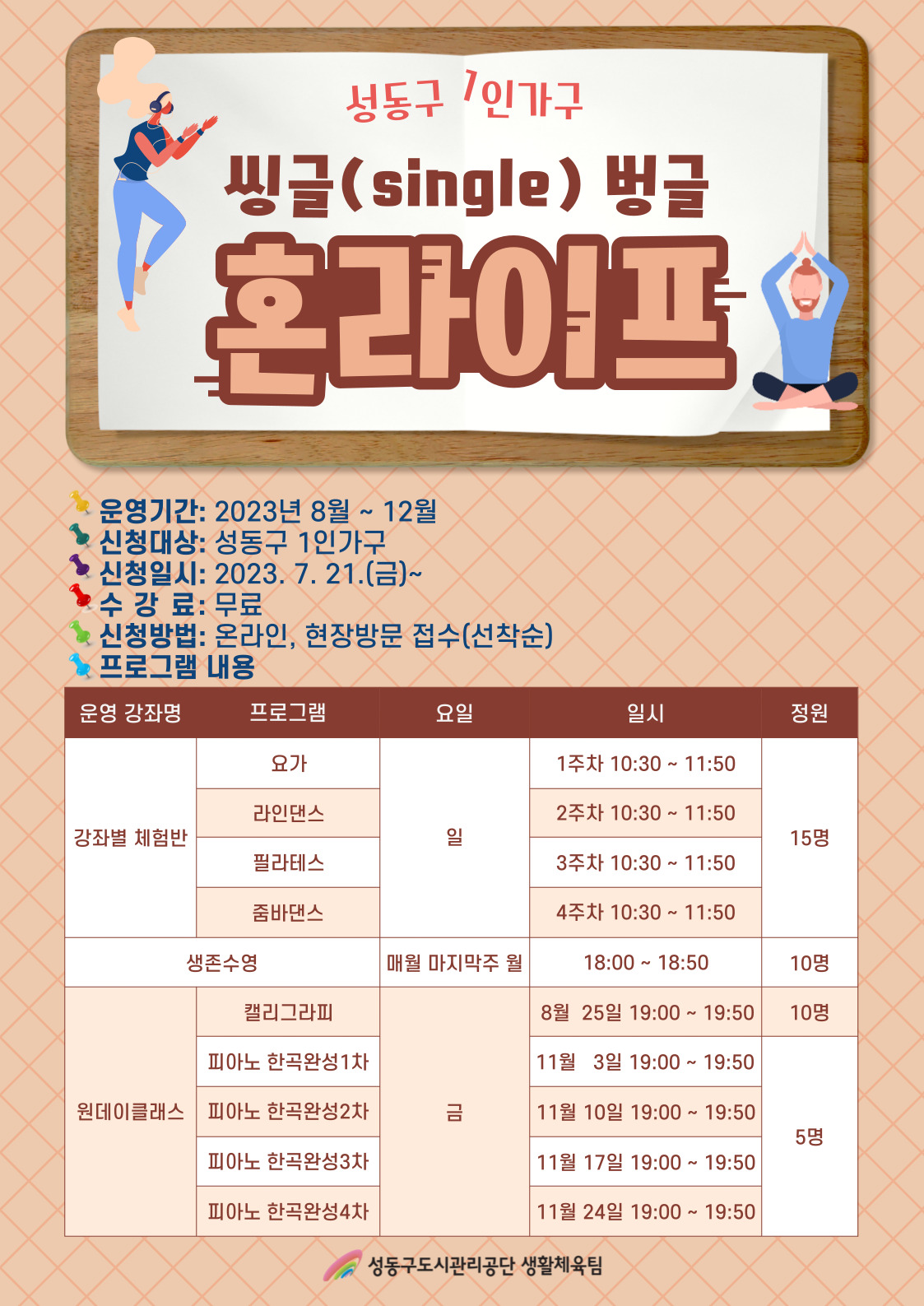 [성동구민종합체육센터] 씽글(Single)벙글 혼라이프 작성자 관리자 등록일자 2023년 7월 12일 17시 9분 44초 조회 1,398 기타 자세한 내용은 02)2204-7600 으로 문의해주세요 혼라이프-001.jpg [ Size : 455.53KB , Down : 1,312 ] 미리보기 다운로드 목록보기