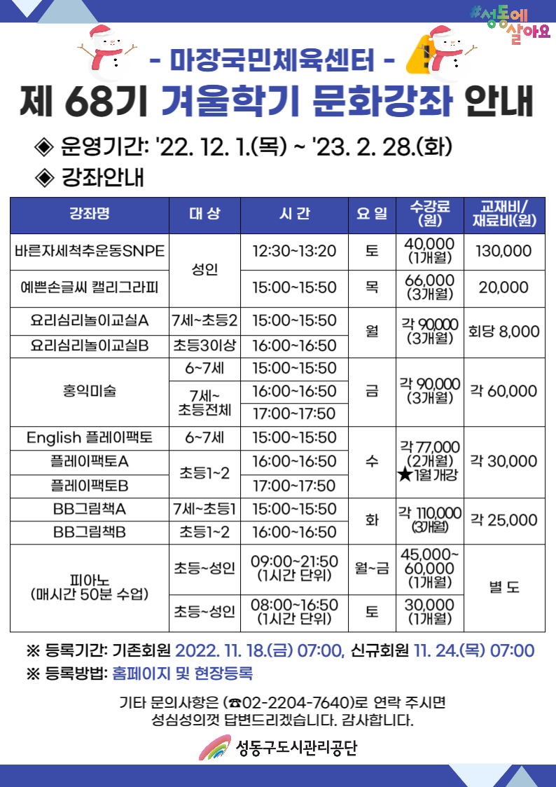 마장국민체육센터 제 68기 겨울학기 문화강좌 운영 안내 작성자 관리자 등록일자 2022년 11월 10일 13시 26분 9초 조회 1,043 마장 68기 문화강좌(최종).png [ Size : 272.28KB , Down : 589 ] 미리보기 다운로드 목록보기