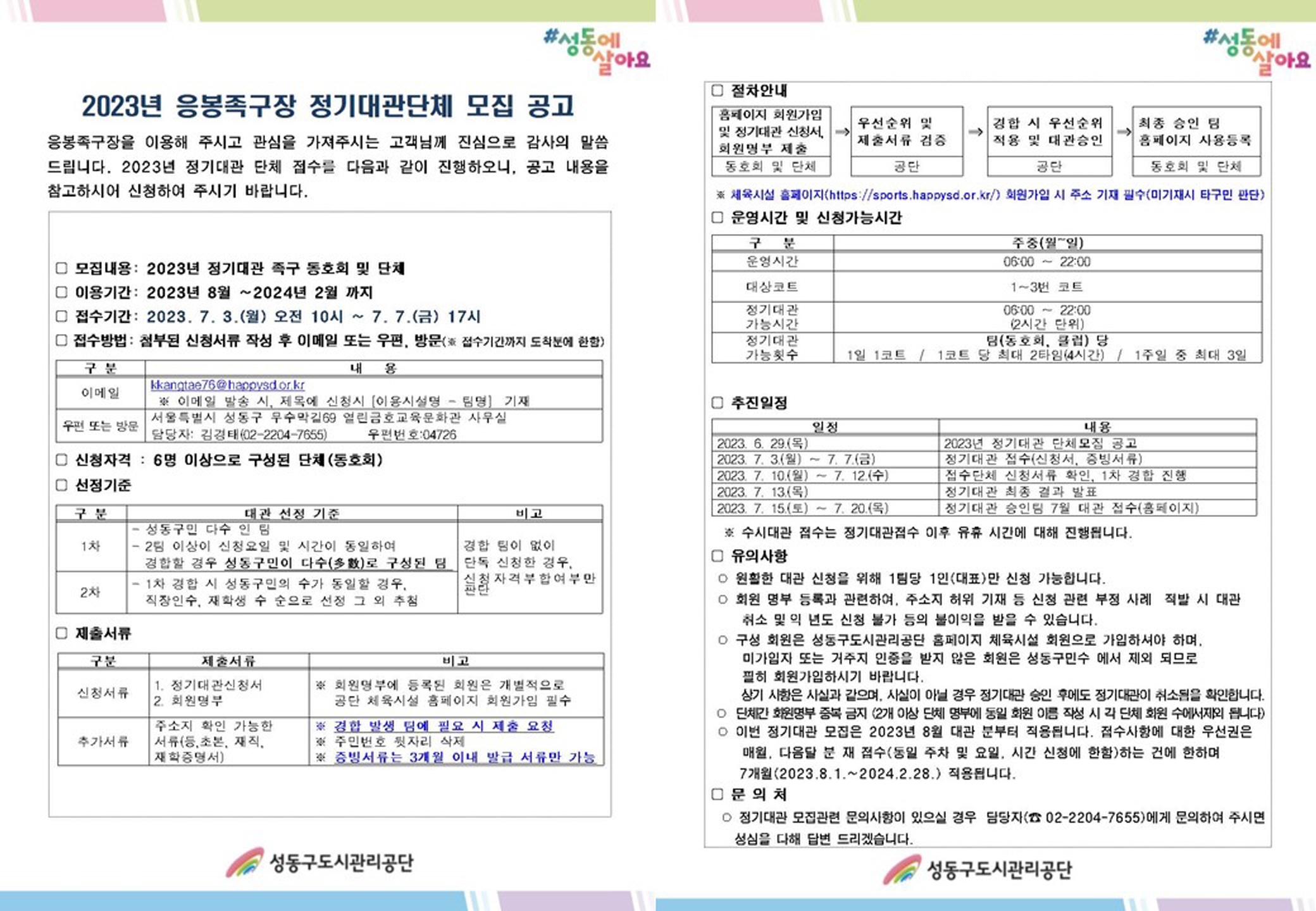 [응봉족구장] 2023년 정기대관 모집 안내문 작성자 관리자 등록일자 2023년 6월 28일 11시 33분 17초 조회 645 응봉족구장 정기대관단체 회원명부.xls [ Size : 83.5KB , Down : 521 ] 다운로드 2023년정기대관신청서(응봉족구장).hwp [ Size : 24KB , Down : 384 ] 다운로드 응봉족구장 정기대관모집.jpg [ Size : 825.88KB , Down : 520 ] 미리보기 다운로드 목록보기