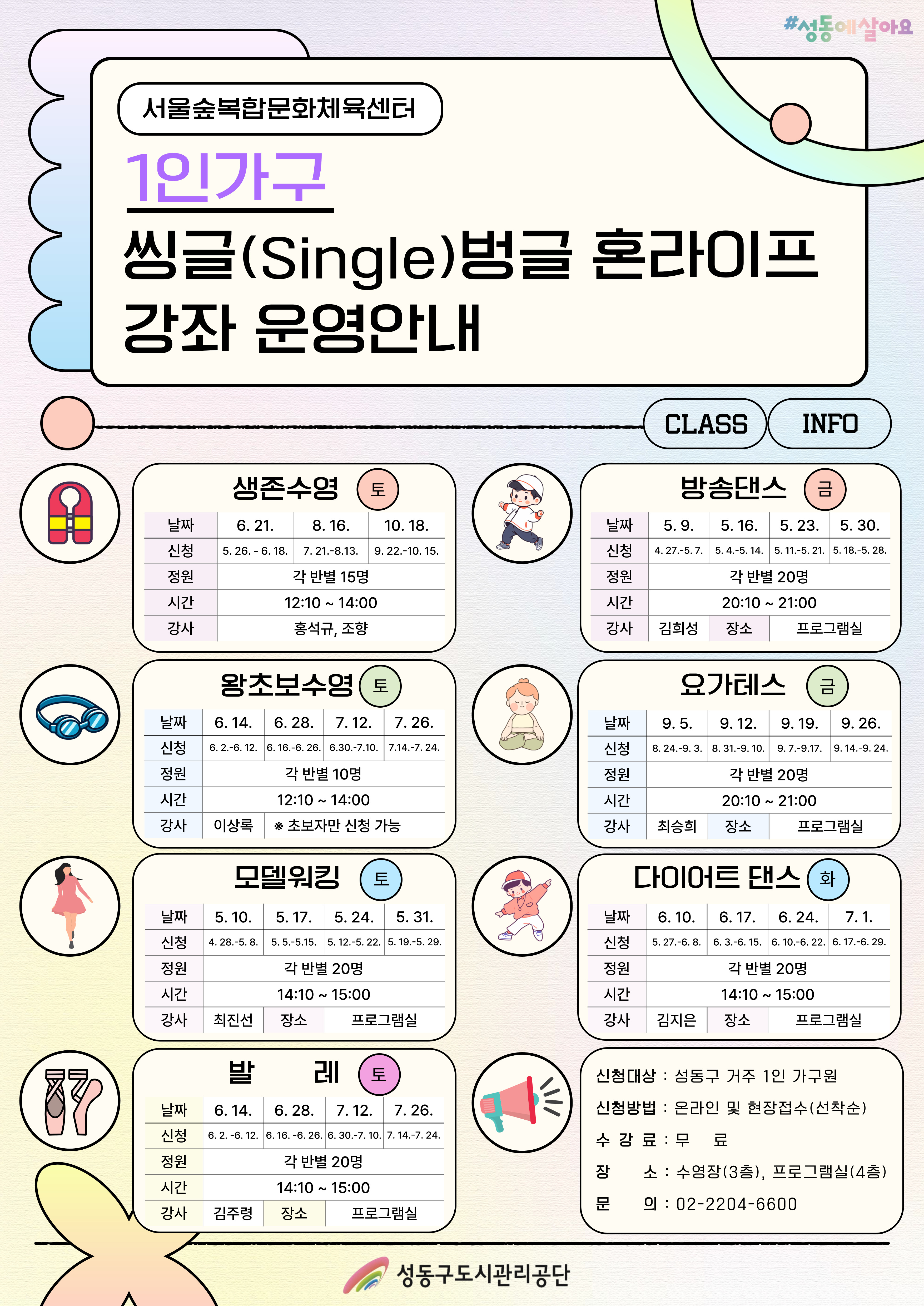 [서울숲복합문화체육센터] 1인가구 씽글벙글 혼라이프 강좌 운영안내 작성자 관리자 등록일자 2025년 4월 22일 15시 2분 21초 조회 537 1인가구수업안내문.jpg [ Size : 2.56MB , Down : 589 ] 미리보기 다운로드 목록보기