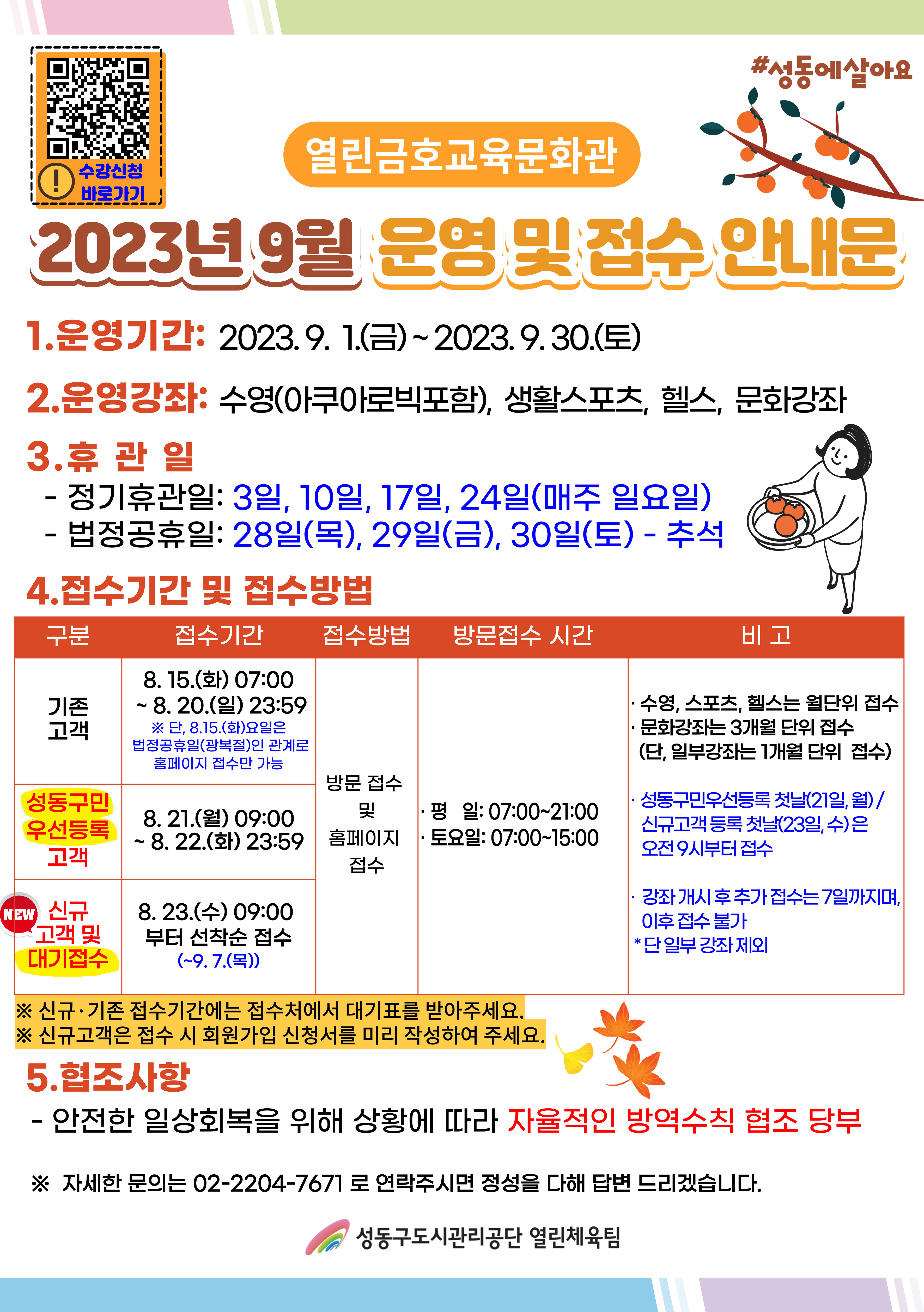 [열린금호교육문화관] 2023년 9월 강좌 운영 및 접수 안내 작성자 관리자 등록일자 2023년 8월 10일 9시 26분 57초 조회 1,141 열린금호교육문화관.jpg [ Size : 2.14MB , Down : 899 ] 미리보기 다운로드 목록보기