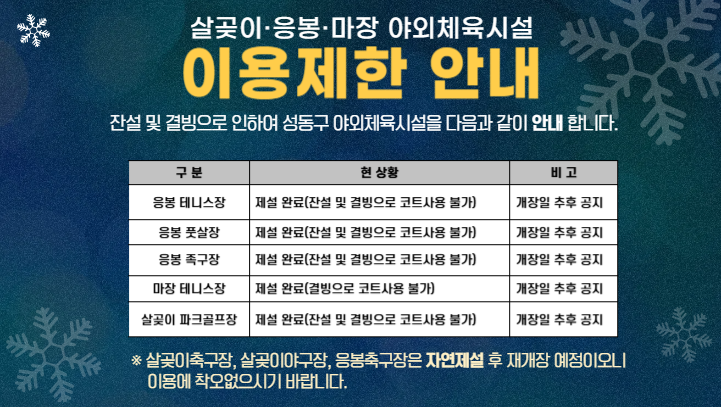 성동구 야외체육시설 이용제한 안내 작성자 관리자 등록일자 2025년 1월 28일 12시 15분 13초 조회 426 001.png [ Size : 450.46KB , Down : 304 ] 미리보기 다운로드 목록보기