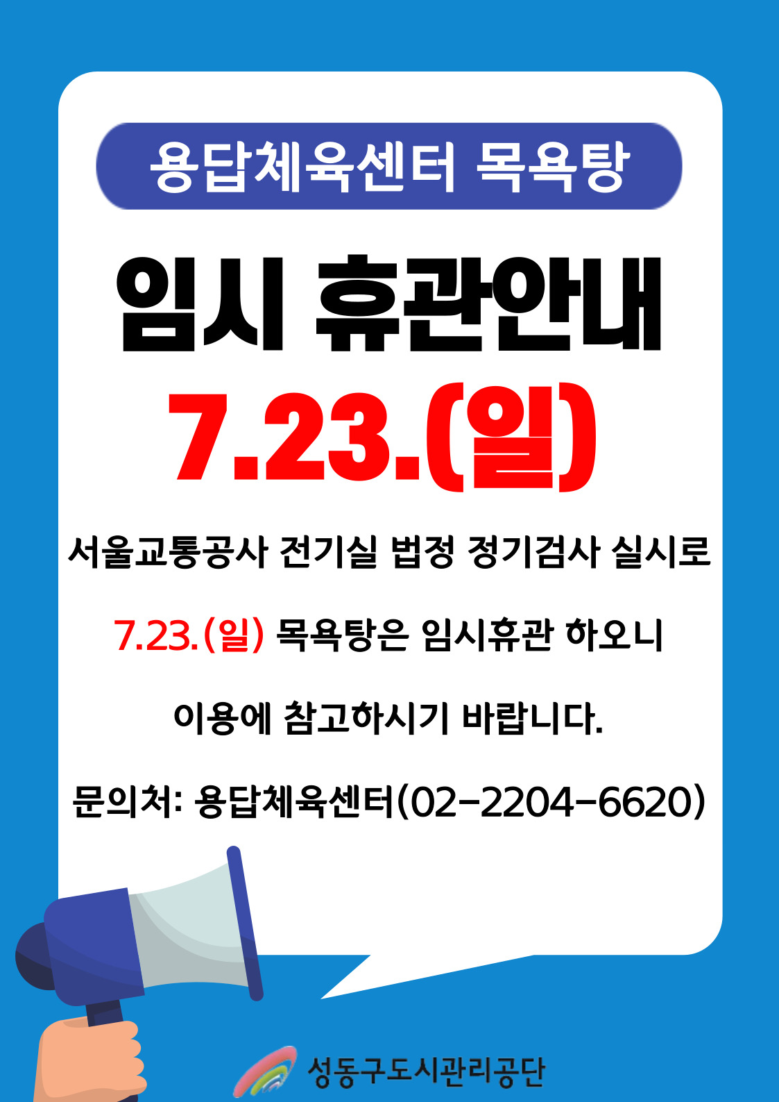 [용답체육센터] 목욕탕 임시 휴관 안내 작성자 관리자 등록일자 2023년 7월 20일 15시 21분 25초 조회 605 111. 목욕탕 임시휴관 안내(홈페이지).jpg [ Size : 215.3KB , Down : 424 ] 미리보기 다운로드 목록보기