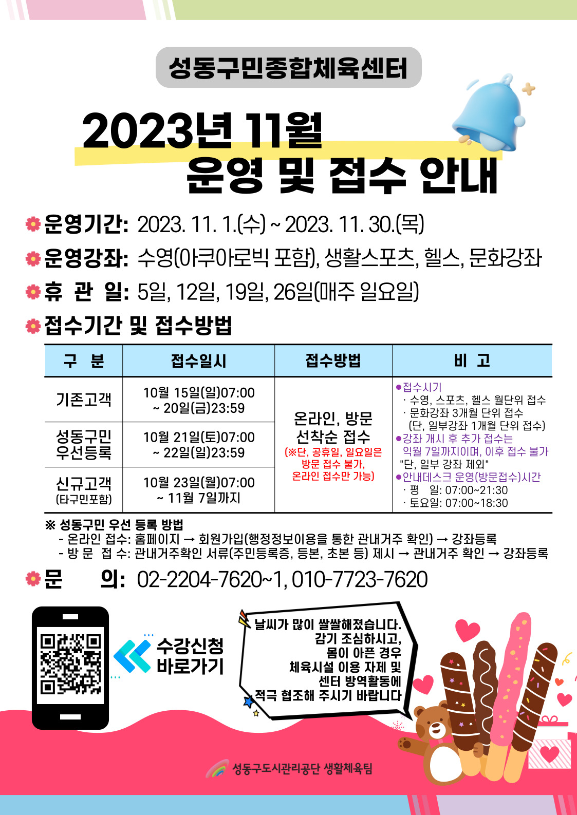 [성동구민종합체육센터]2023년 11월 운영 및 접수 안내 작성자 관리자 등록일자 2023년 10월 16일 17시 14분 28초 조회 988 운영-및-접수안내-10.jpg [ Size : 395.46KB , Down : 875 ] 미리보기 다운로드 목록보기