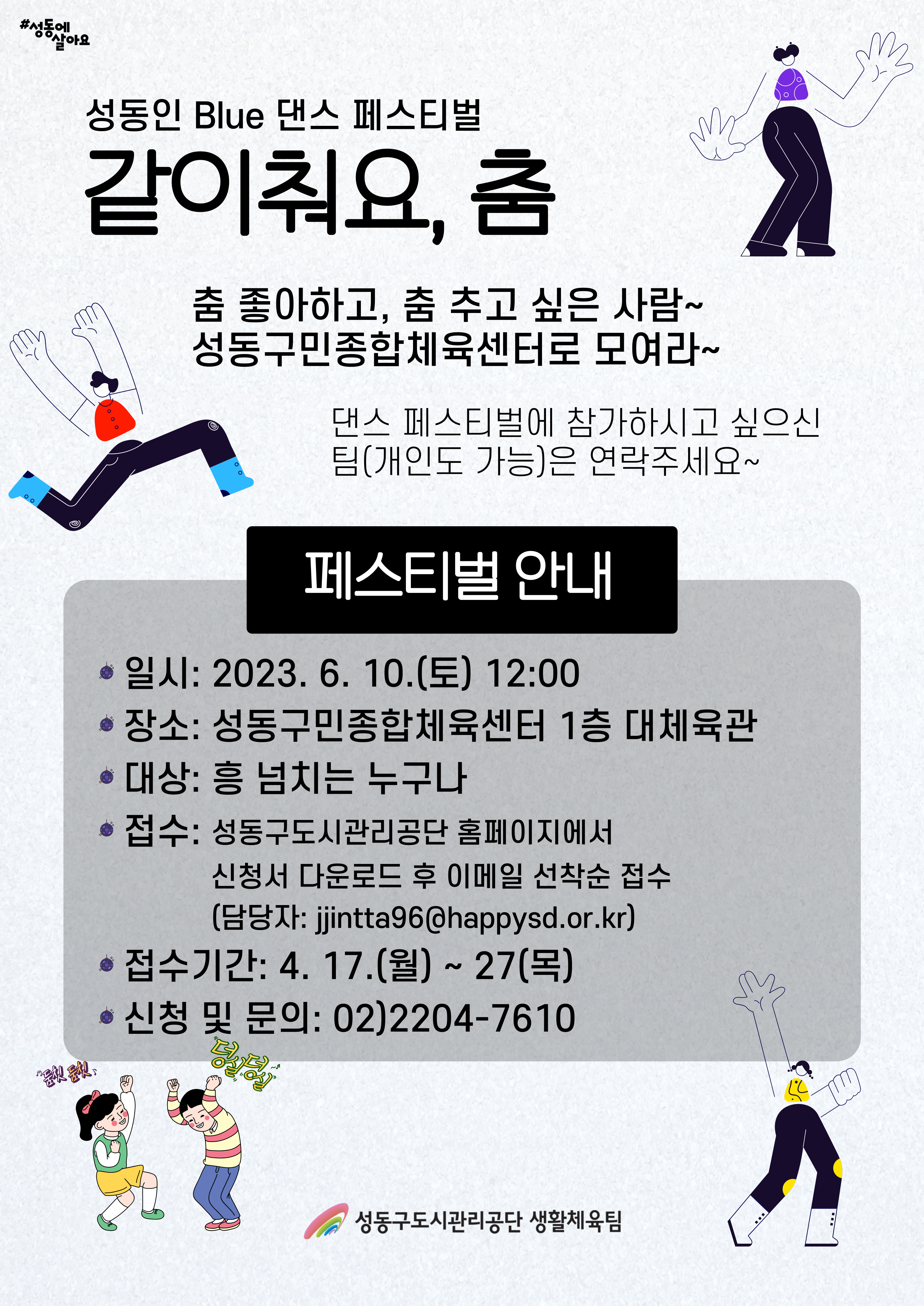 [성동구민종합체육센터] 성동인 Blue 댄스 페스티벌 참가자 모집 안내 작성자 관리자 등록일자 2023년 4월 17일 11시 54분 57초 조회 1,226 댄스페스티벌-001.jpg [ Size : 2.51MB , Down : 409 ] 미리보기 다운로드 정오페스티벌 참가 신청서.hwp [ Size : 32KB , Down : 556 ] 다운로드 목록보기