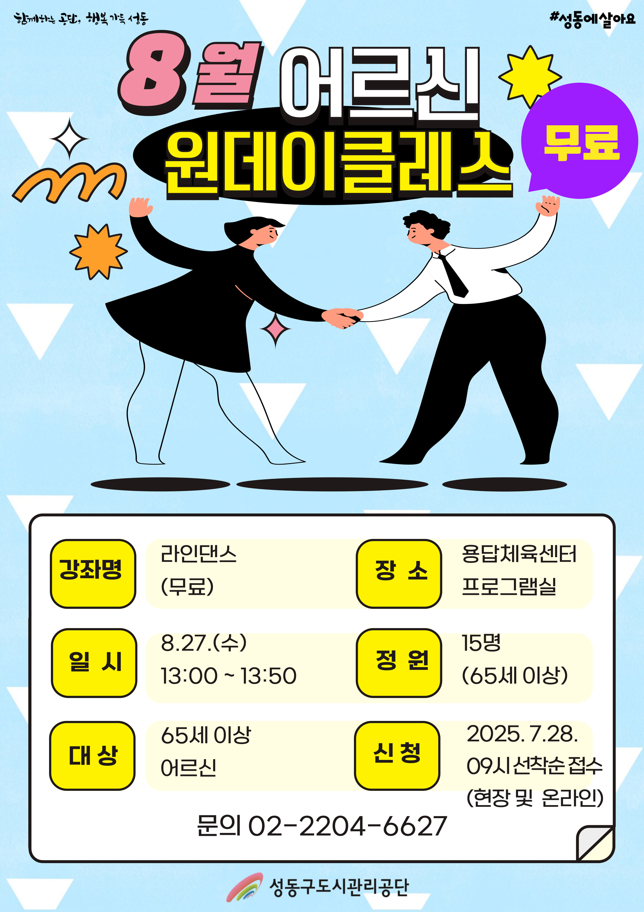 [용답체육센터]8월 사회적배려자 원데이클래스 접수안내 작성자 관리자 등록일자 2025년 7월 25일 8시 19분 51초 조회 244 8월 어르신 원데이클레스 홍보물.jpg [ Size : 1.09MB , Down : 121 ] 미리보기 다운로드 목록보기