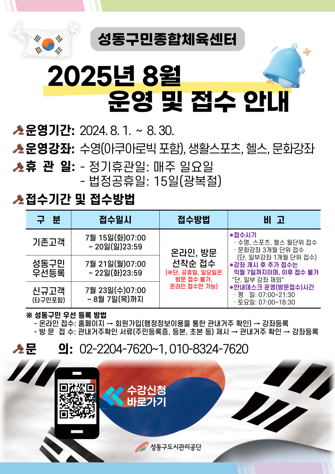 [성동구민종합체육센터] 8월 운영 및 접수 안내