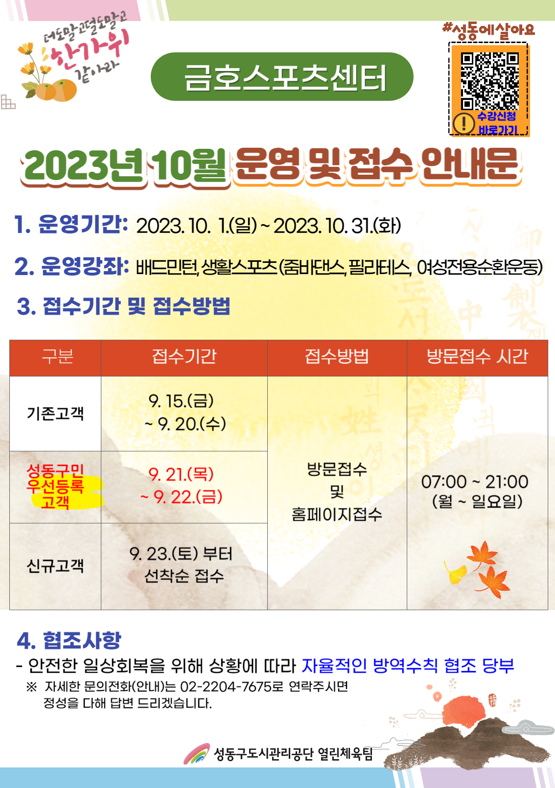[금호스포츠] 2023년 10월 운영 및 접수 안내문 작성자 관리자 등록일자 2023년 9월 11일 13시 33분 19초 조회 515 금호스포츠.png [ Size : 1.18MB , Down : 274 ] 미리보기 다운로드 목록보기