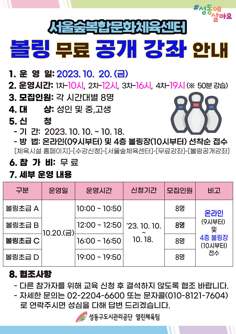 서울숲복합문화체육센터 볼링 무료 공개강좌 모집 작성자 관리자 등록일자 2023년 10월 6일 13시 44분 58초 조회 631 볼링 무료공개 강좌 신청 클릭 -> 붙임2. 볼링 무료 공개강좌 운영 및 모집 홍보 안내문(안).jpg [ Size : 245.72KB , Down : 422 ] 미리보기 다운로드 목록보기