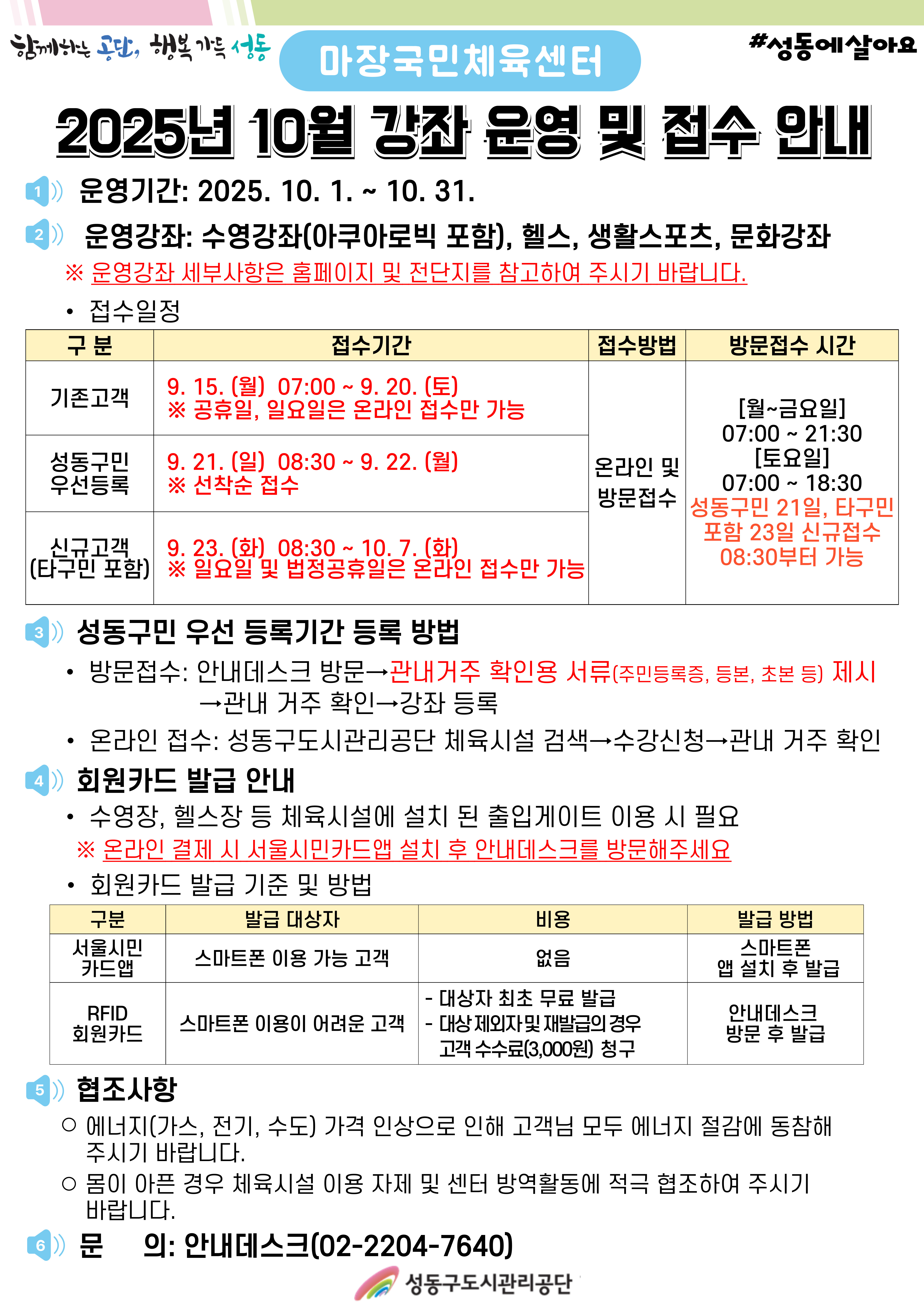 [마장국민체육센터] 10월 운영 및 접수 안내 작성자 관리자 등록일자 2025년 9월 12일 15시 45분 41초 조회 485 마장센터 10월 강좌 운영 및 접수 안내.jpg [ Size : 2.8MB , Down : 537 ] 미리보기 다운로드 목록보기