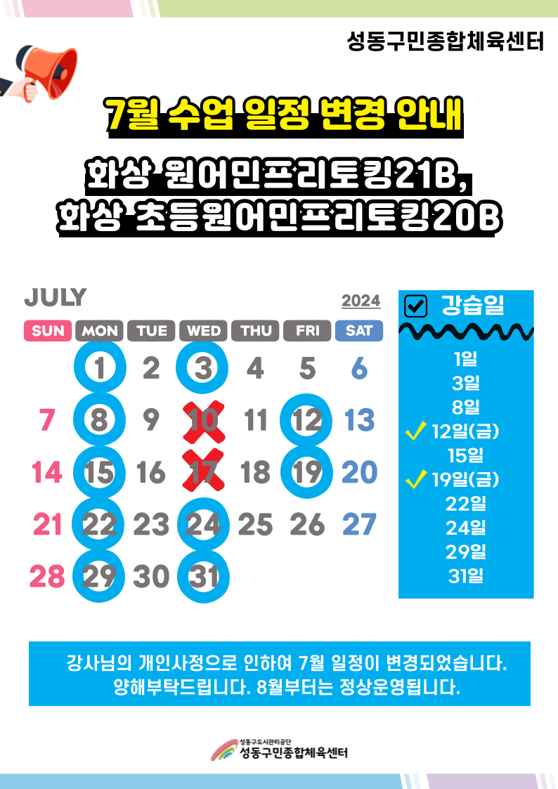 [성동구민종합체육센터] 화상강좌 7월 일정 임시변경 안내 작성자 관리자 등록일자 2024년 6월 14일 11시 47분 48초 조회 696 성동구민종합체육센터 화상강좌 강사의 개인사정으로 7월 강좌 운영일정이 한시적으로 변경되었음을 알려드립니다. 8월부터는 정상 운영되오니 이용에 참고하시길 바랍니다.- 임시변경 기간: 2024. 7. 1.(월) ~ 31.(수) 수업일정변경(화상강좌).png [ Size : 184.64KB , Down : 545 ] 미리보기 다운로드 목록보기