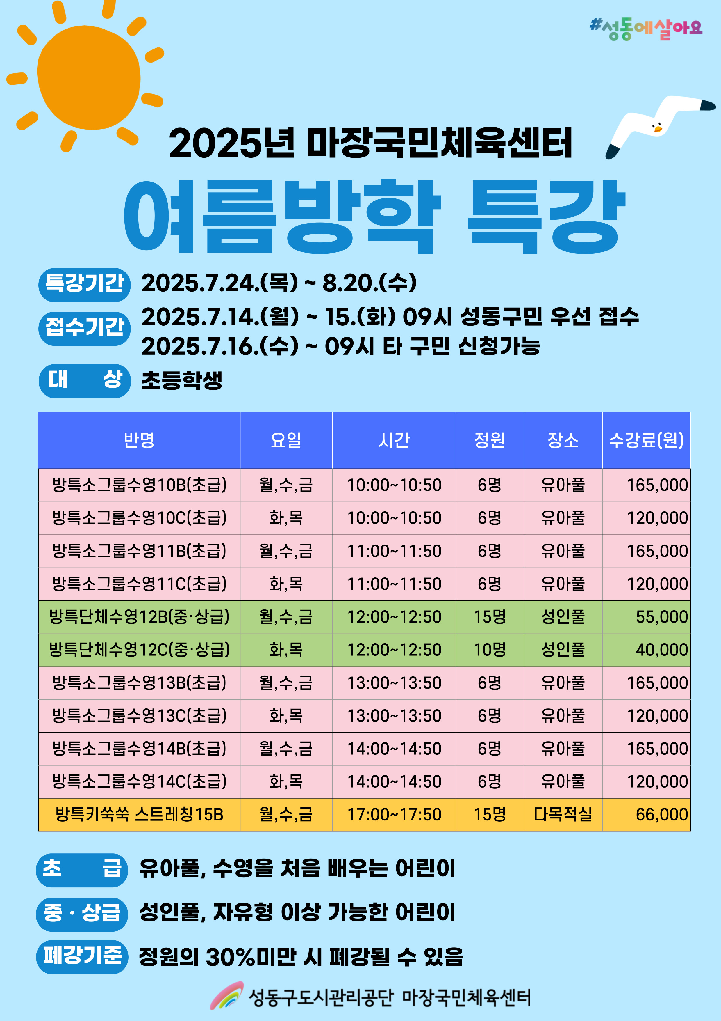 2025년 마장국민체육센터 여름방학특강 운영 안내 작성자 관리자 등록일자 2025년 6월 26일 9시 16분 35초 조회 851 25년 여름방학특강 안내문.jpg [ Size : 1.19MB , Down : 1,052 ] 미리보기 다운로드 목록보기