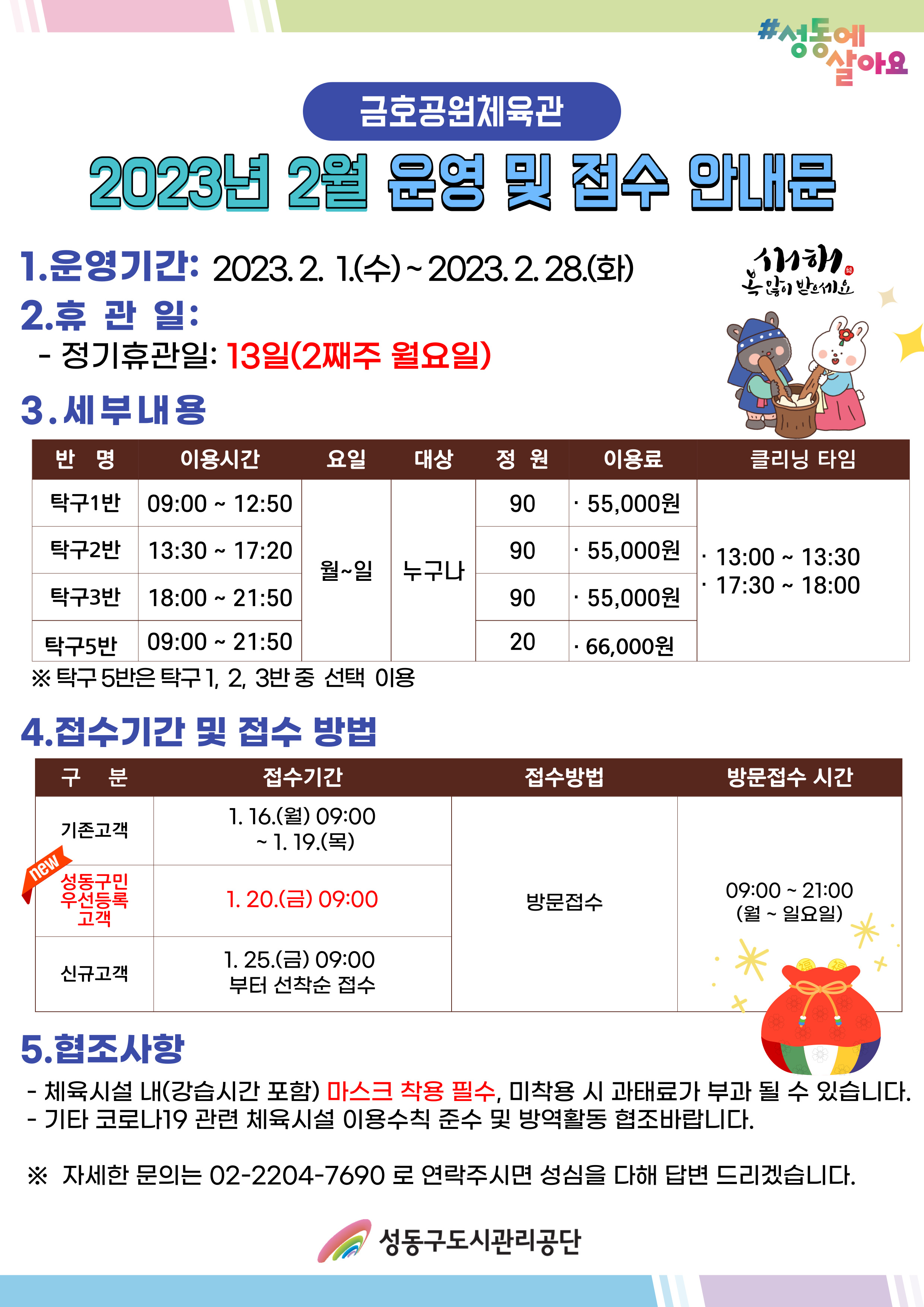 [금호공원체육관] 2023년 2월 강좌 운영 및 접수 안내 작성자 관리자 등록일자 2023년 1월 12일 9시 34분 3초 조회 660 2023년 2월 운영 및 접수안내문(금호공원).jpg [ Size : 1.02MB , Down : 278 ] 미리보기 다운로드 목록보기