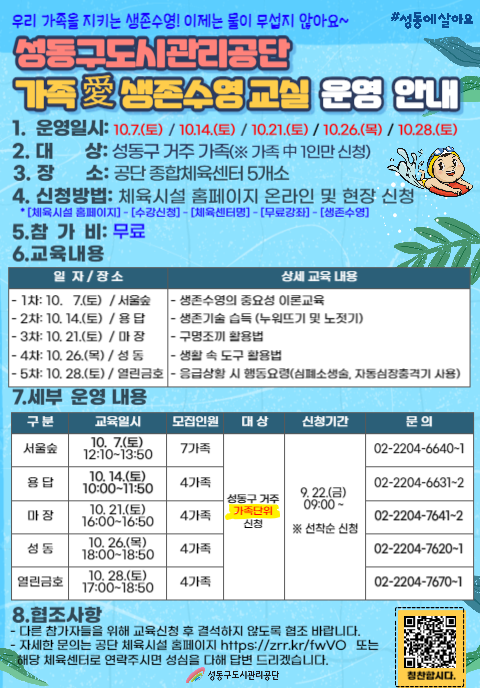 성동구도시관리공단 가족 愛 생존수영 운영 안내 작성자 관리자 등록일자 2023년 9월 20일 15시 21분 0초 조회 1,022 가족 愛 생존수영교실 운영 안내문.png [ Size : 319.82KB , Down : 860 ] 미리보기 다운로드 목록보기
