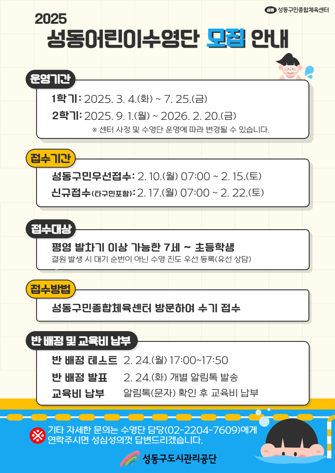 2025년도 성동어린이수영단 신규 단원 모집 안내 작성자 관리자 등록일자 2025년 2월 6일 15시 37분 6초 조회 1,602 체계적인 수영교육과 수중안전을 위한 생존수영까지 배울 수 있는 성동어린이수영단에 신청하세요~ 2025년도어린이수영단-001.jpg [ Size : 576.46KB , Down : 494 ] 미리보기 다운로드 목록보기
