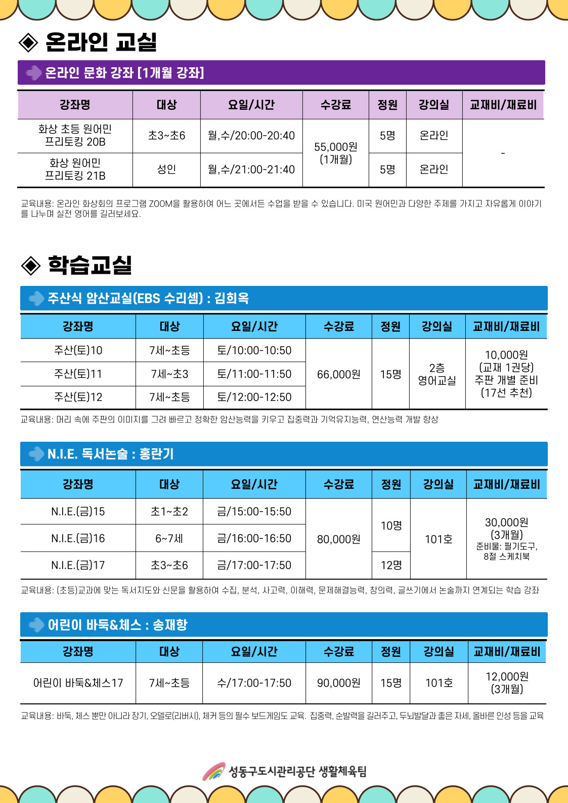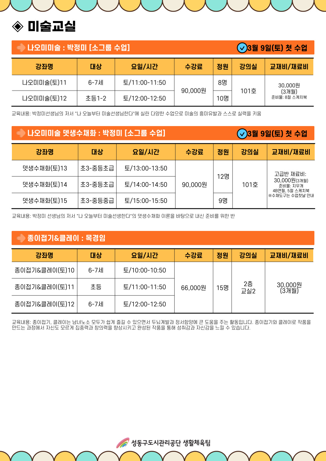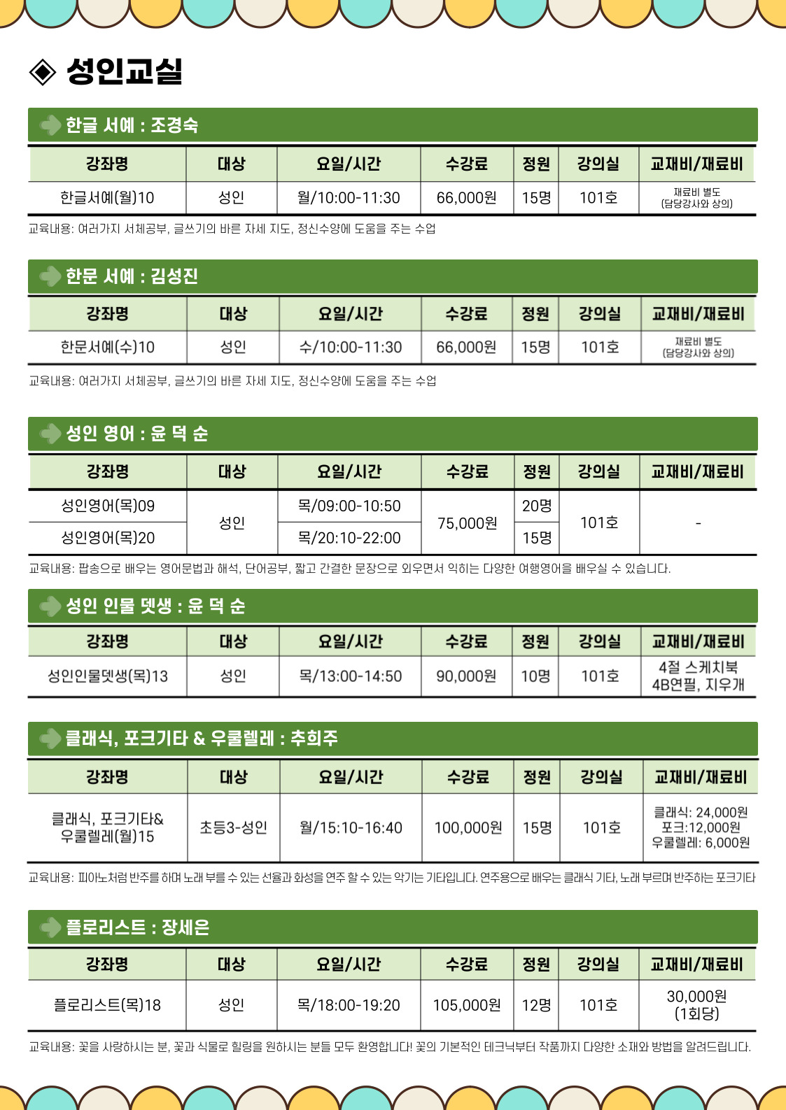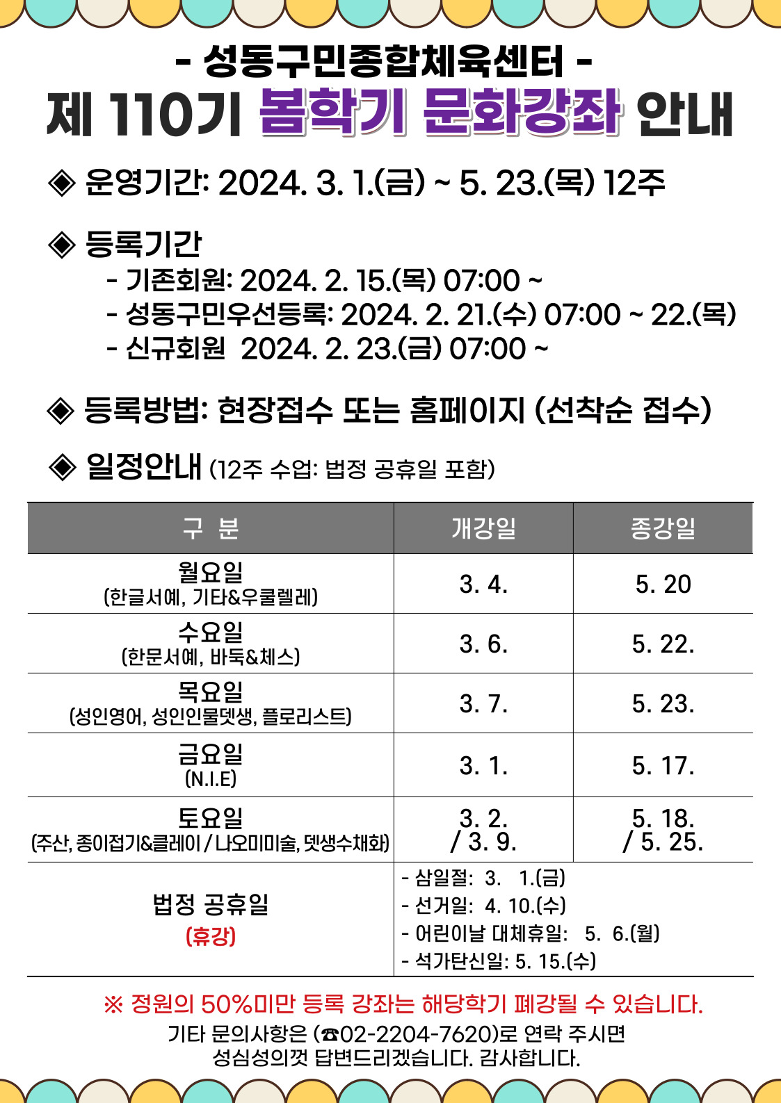 [성동구민종합체육센터] 제110기 봄학기 문화강좌 안내 작성자 관리자 등록일자 2024년 1월 31일 16시 22분 15초 조회 676 001.jpg [ Size : 341.01KB , Down : 428 ] 미리보기 다운로드 002.jpg [ Size : 389.17KB , Down : 425 ] 미리보기 다운로드 003.jpg [ Size : 362.36KB , Down : 424 ] 미리보기 다운로드 004.jpg [ Size : 336.64KB , Down : 432 ] 미리보기 다운로드 목록보기