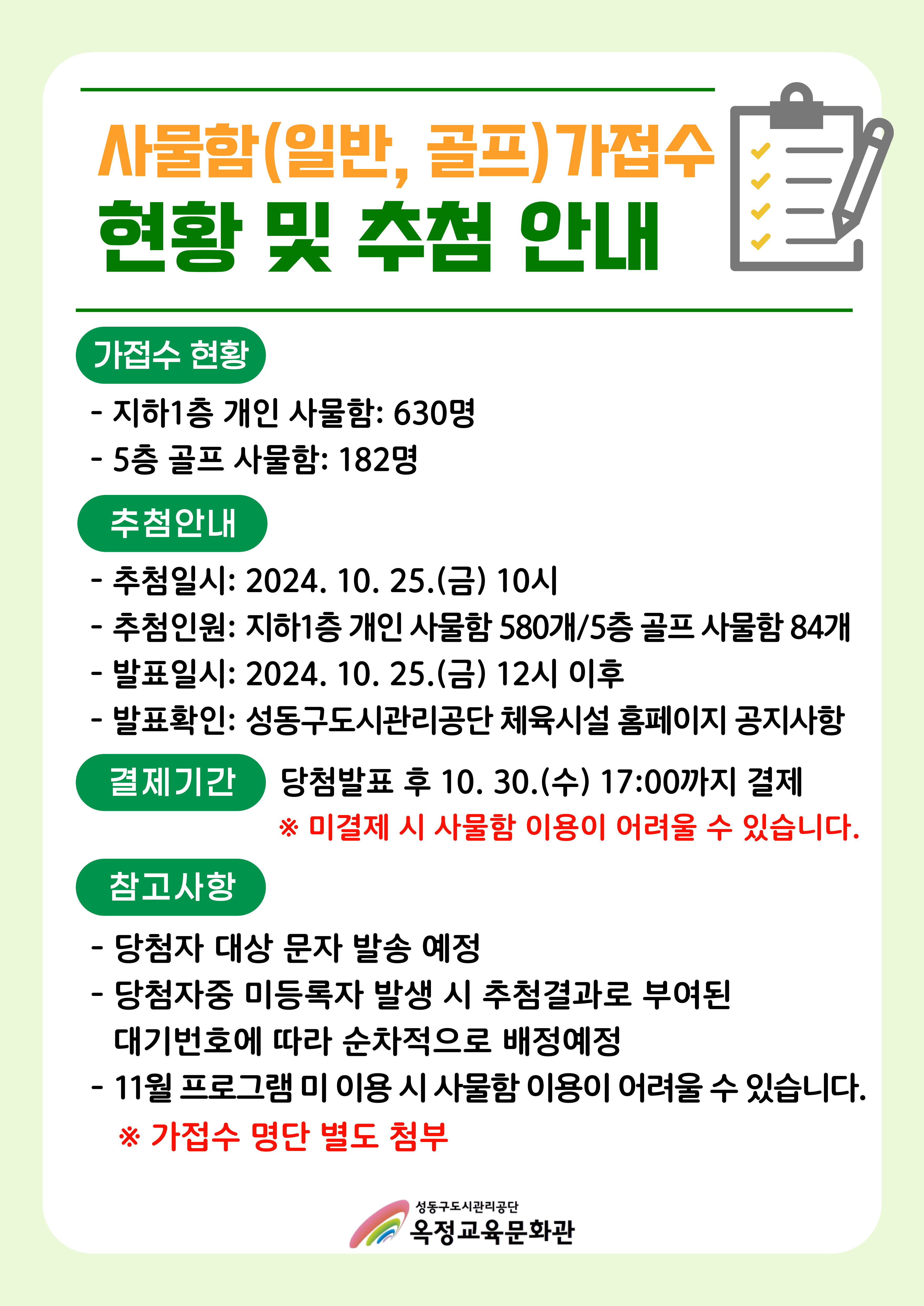 [옥정교육문화관] 유료 사물함(일반, 골프) 가접수 현황 및 추첨 안내