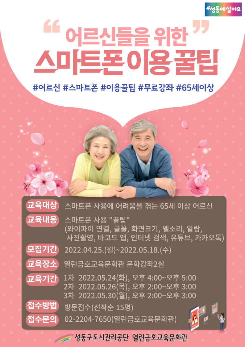 [열린금호교육문화관] 어르신들을 위한 스마트폰 이용 꿀팁 강좌 운영 안내 작성자 관리자 등록일자 2022년 5월 13일 11시 23분 58초 조회 974 스마트폰 “이용꿀팁” 무료공개강좌 운영 안내.jpg [ Size : 221.11KB , Down : 324 ] 미리보기 다운로드 목록보기