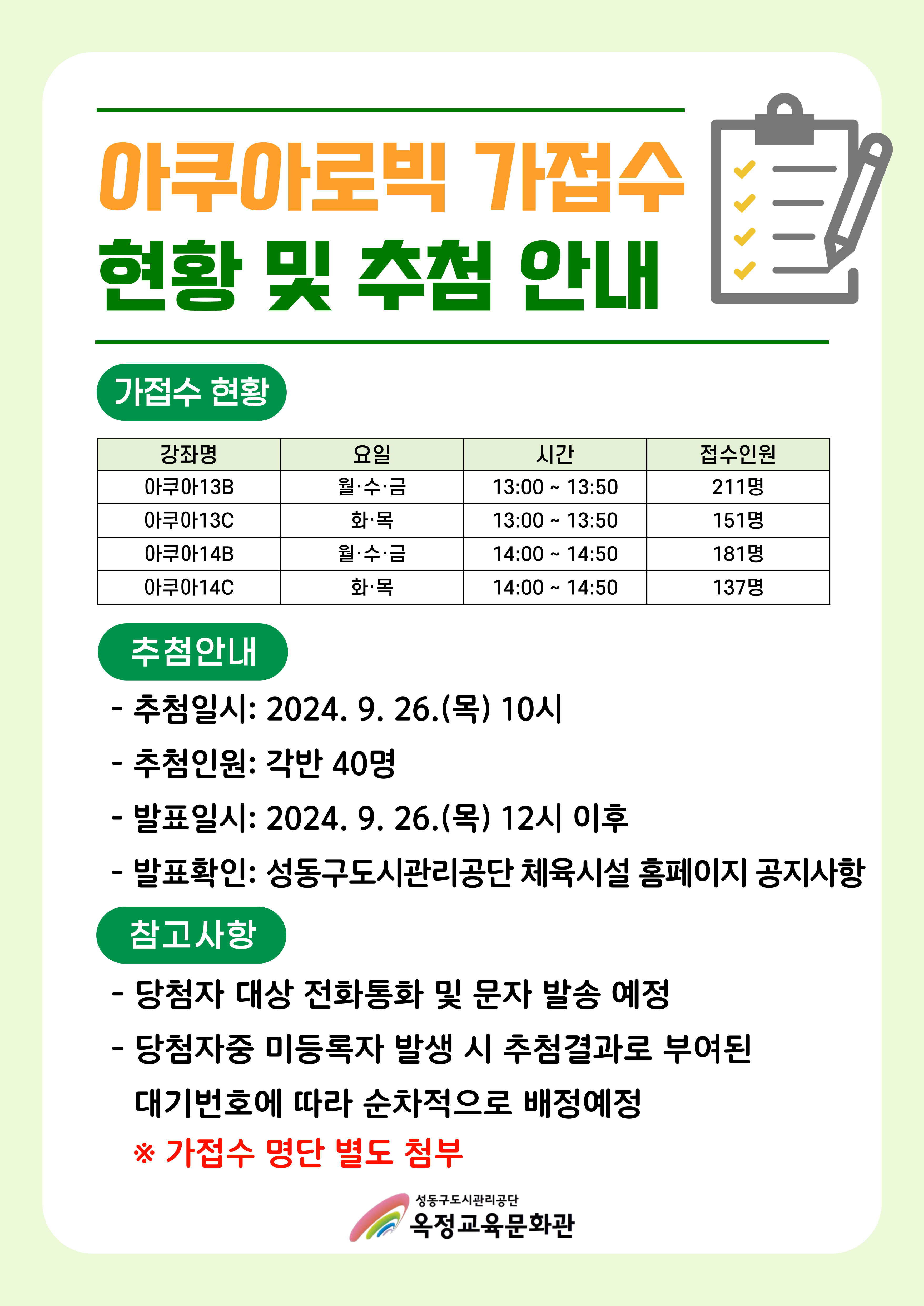 [옥정교육문화관] 아쿠아로빅 가접수 현황 및 추첨 안내