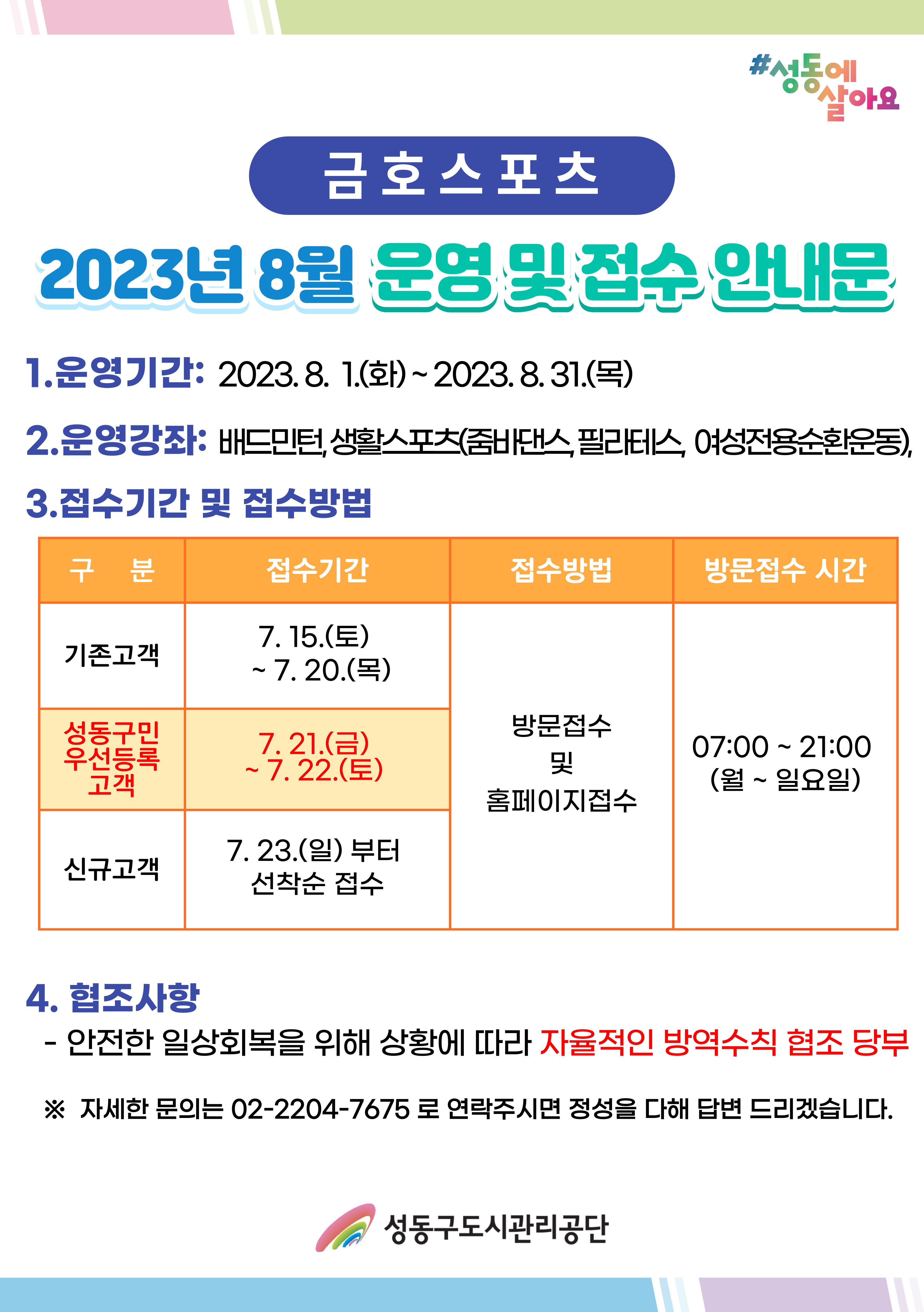 [금호스포츠] 2023년 8월 운영 및 접수 안내문 작성자 관리자 등록일자 2023년 7월 19일 10시 40분 9초 조회 543 2023년 8월 운영 및 접수안내문_금호스포츠.jpg [ Size : 1.25MB , Down : 255 ] 미리보기 다운로드 목록보기