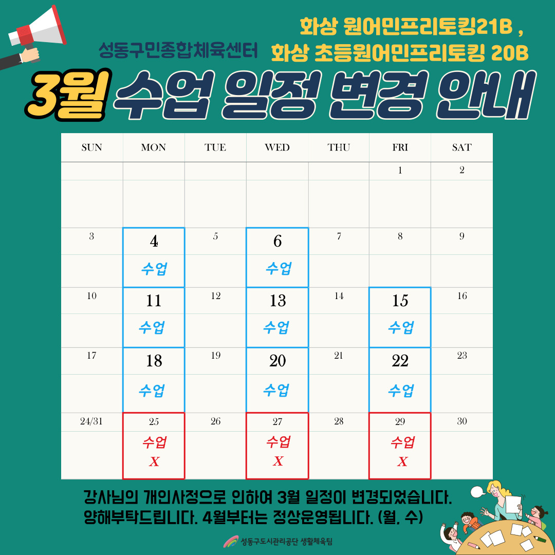 [성동구민종합체육센터] 화상원어민프리토킹 3월 수업일정 변경 안내 작성자 관리자 등록일자 2024년 2월 8일 13시 14분 35초 조회 841 수업일정변경안내.jpg [ Size : 261.56KB , Down : 705 ] 미리보기 다운로드 목록보기