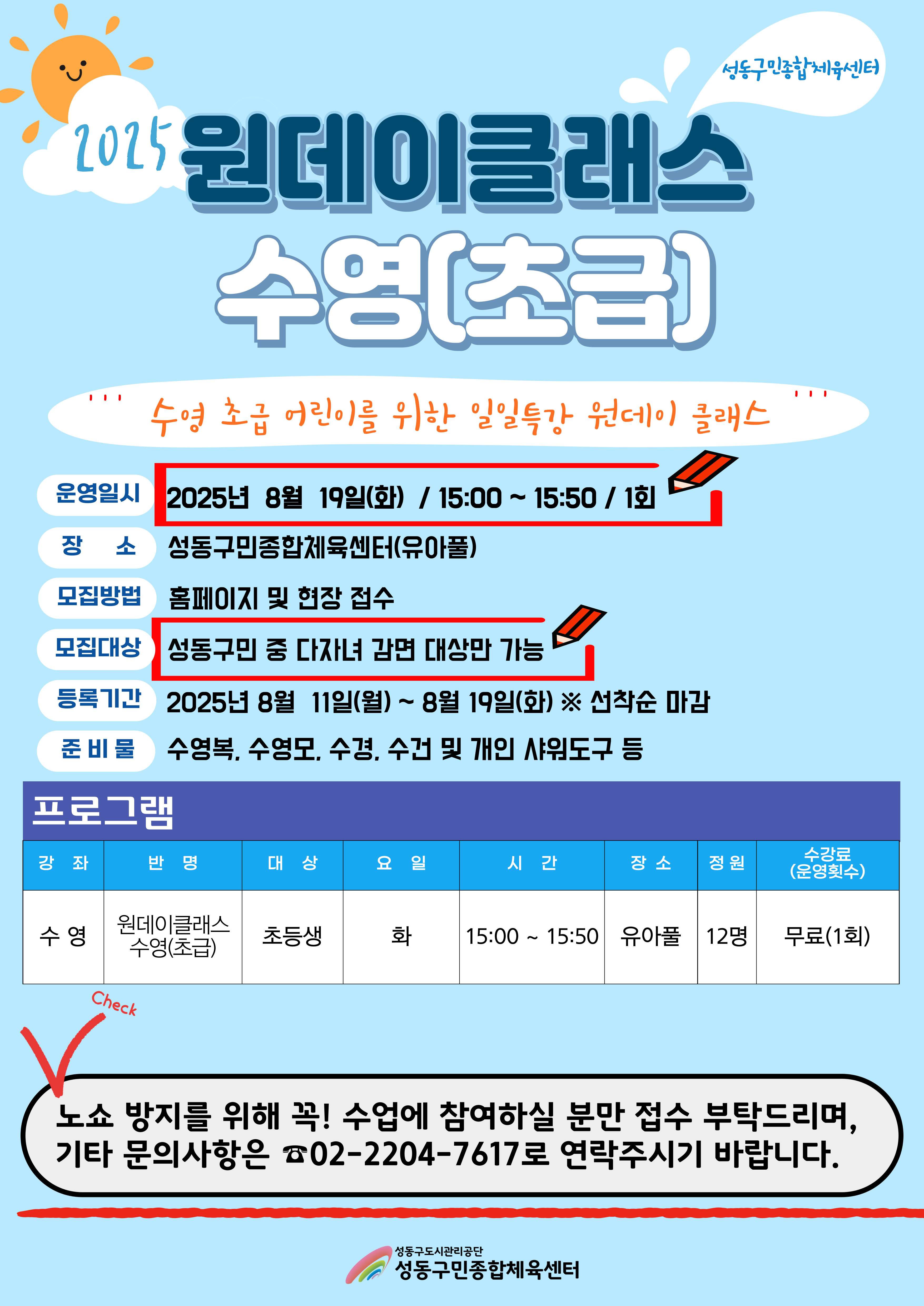 [성동구민종합체육센터] 원데이클래스 수영(초급) 참가자 모집 안내