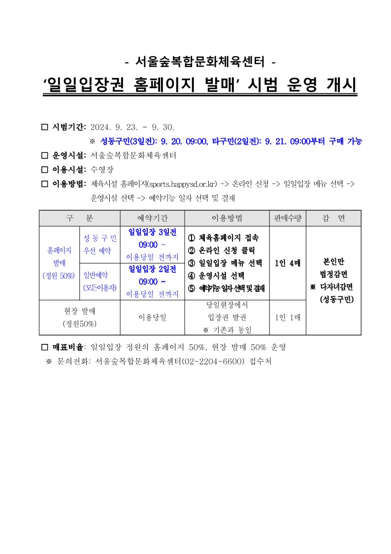 서울숲복합문화체육센터 '일일입장권 홈페이지 발매' 시범 운영 개시 작성자 관리자 등록일자 2024년 9월 4일 17시 28분 56초 조회 1,355 일일입장권 온라인 발매 시범 운영 개시_공지사항_서울숲.jpg [ Size : 122.42KB , Down : 1,433 ] 미리보기 다운로드 목록보기