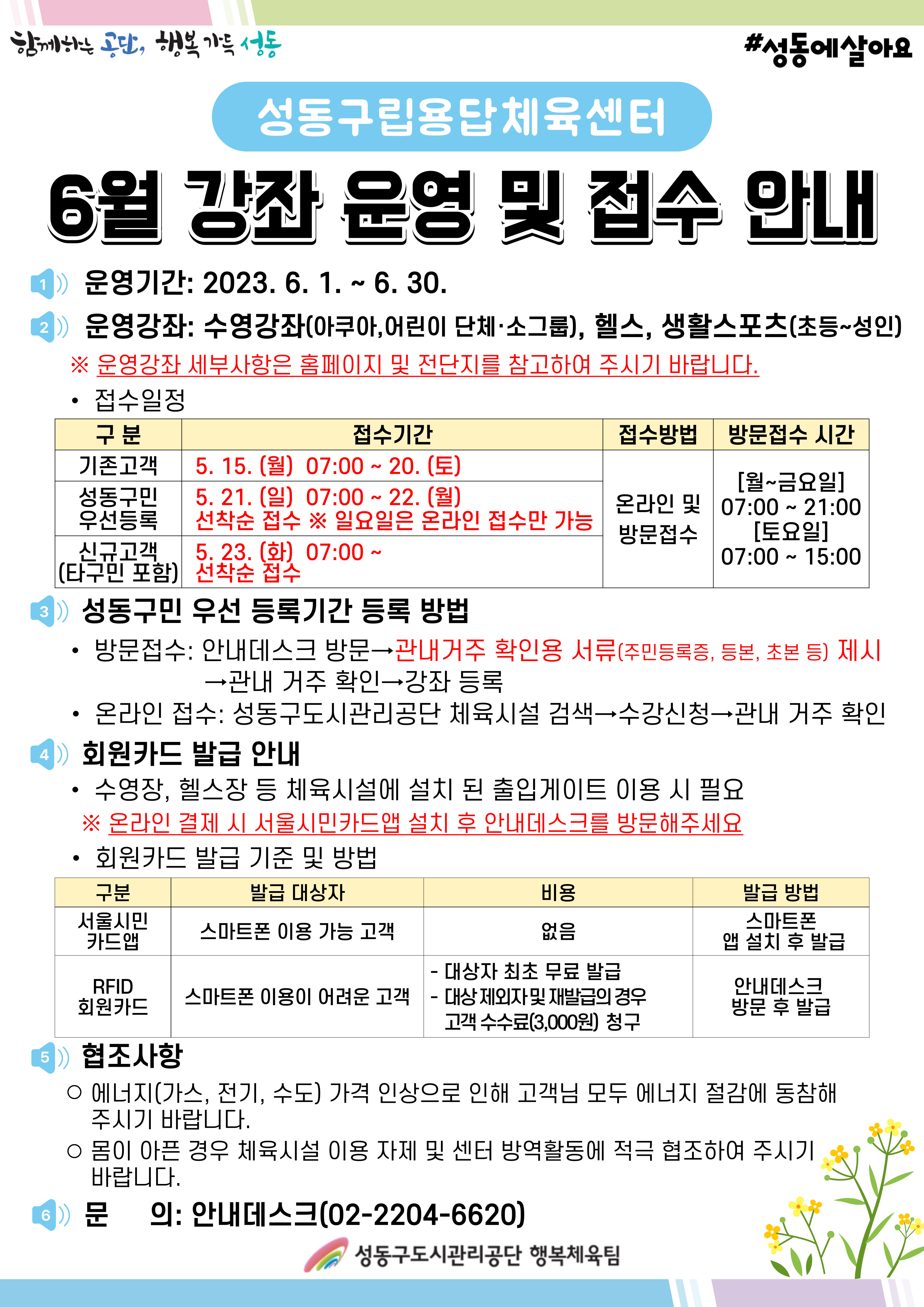 [용답체육센터] 2023년 6월 강좌 운영 및 접수 안내 작성자 관리자 등록일자 2023년 5월 11일 15시 41분 14초 조회 1,038 2023년 6월 강좌 운영 및 접수 안내(용답).jpg [ Size : 1.63MB , Down : 935 ] 미리보기 다운로드 목록보기