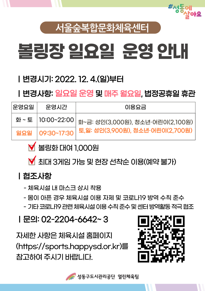 서울숲복합문화체육센터 볼링장 일요일 운영 안내 작성자 관리자 등록일자 2022년 11월 15일 14시 26분 3초 조회 1,591 볼링장 일요일 운영 안내문.png [ Size : 220.77KB , Down : 1,405 ] 미리보기 다운로드 목록보기