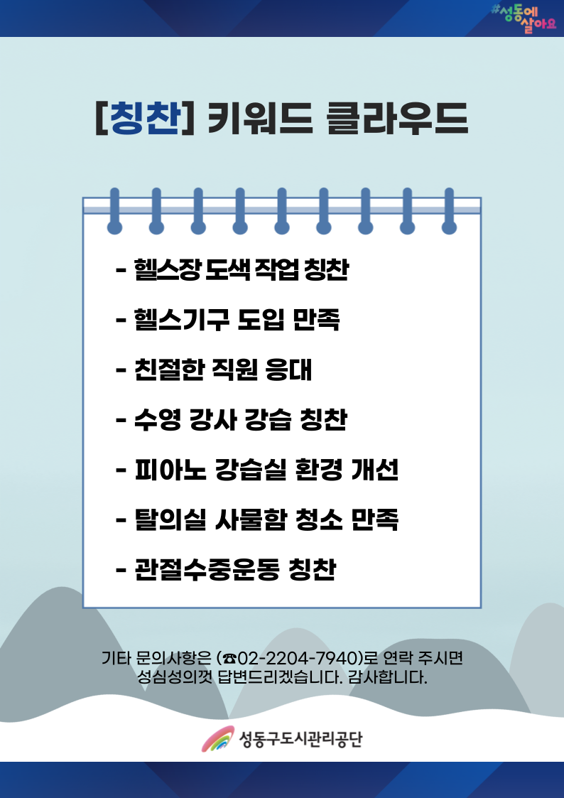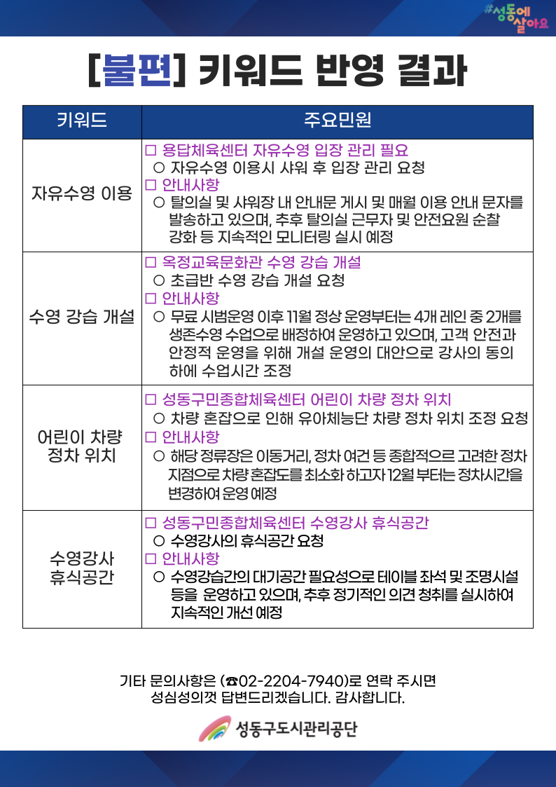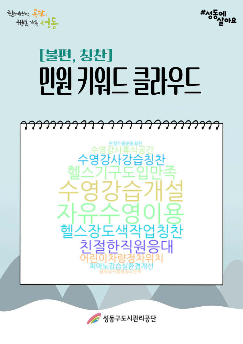 11월 민원 핫 키워드 작성자 관리자 등록일자 2025년 1월 9일 16시 11분 3초 조회 391 성동구도시관리공단 민원 핫 키워드 001.png [ Size : 316.25KB , Down : 234 ] 미리보기 다운로드 002.png [ Size : 278.45KB , Down : 232 ] 미리보기 다운로드 003.png [ Size : 275.44KB , Down : 229 ] 미리보기 다운로드 목록보기