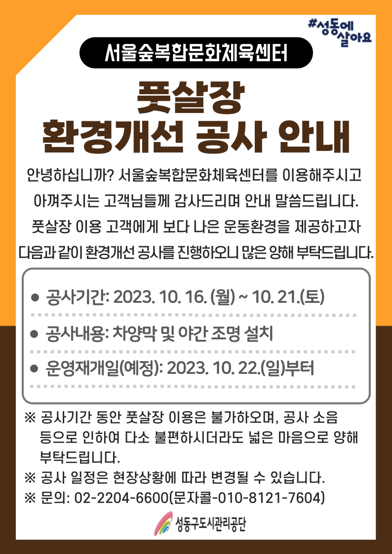 서울숲복합문화체육센터 풋살장 환경개선 공사 안내 작성자 관리자 등록일자 2023년 9월 7일 16시 37분 21초 조회 670 붙임1. 풋살장 환경개선 공사 안내문.png [ Size : 190.89KB , Down : 908 ] 미리보기 다운로드 목록보기