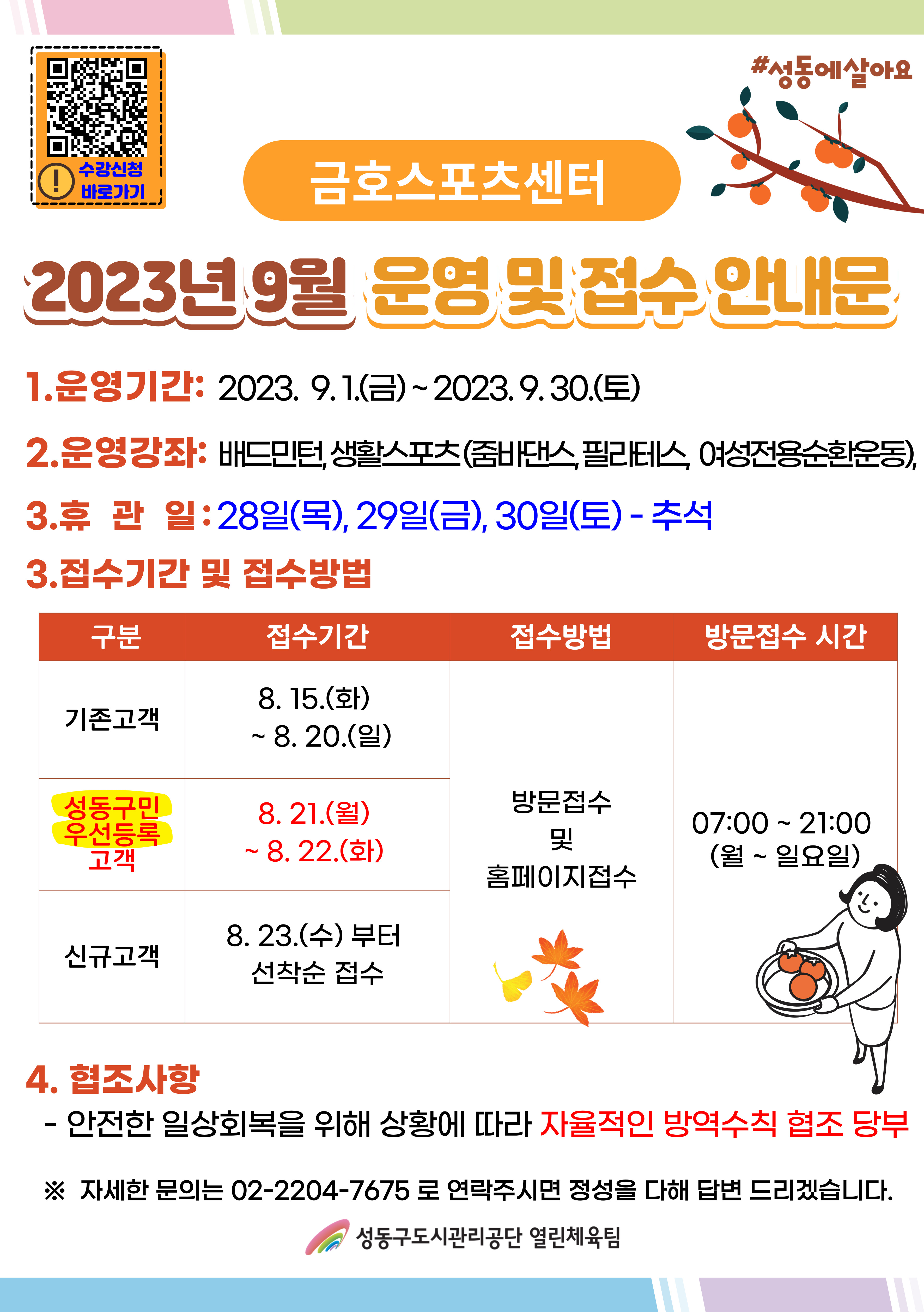 [금호스포츠] 2023년 9월 강좌 운영 및 접수 안내 작성자 관리자 등록일자 2023년 8월 10일 9시 27분 59초 조회 530 금호스포츠센터.jpg [ Size : 1.61MB , Down : 291 ] 미리보기 다운로드 목록보기