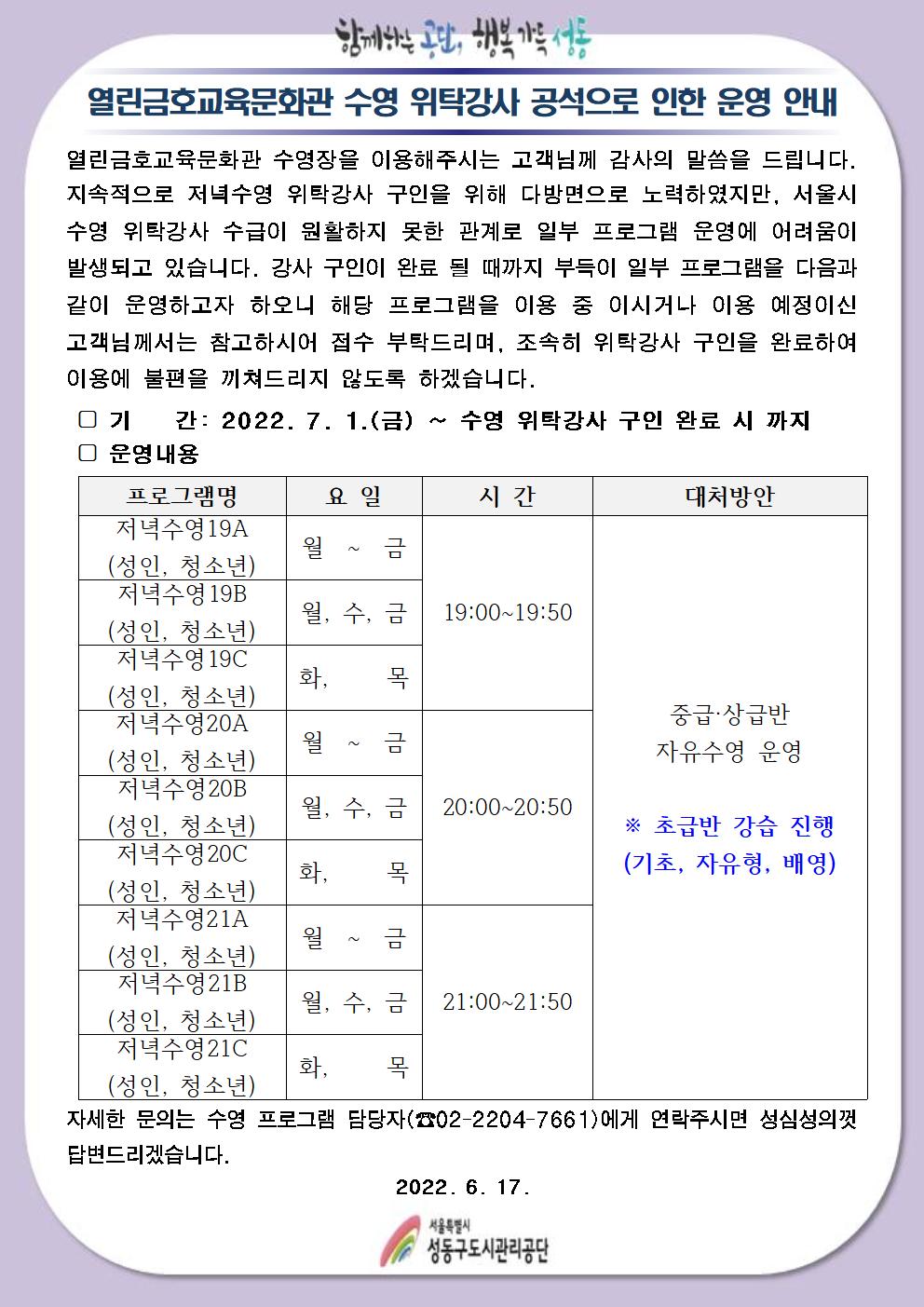[열린금호교육문화관]수영 위탁강사 공석으로 인한 운영 안내 작성자 관리자 등록일자 2022년 5월 16일 16시 5분 59초 조회 1,295 열린금호교육문화관 자유수영 운영 안내문.jpg [ Size : 212.27KB , Down : 732 ] 미리보기 다운로드 목록보기