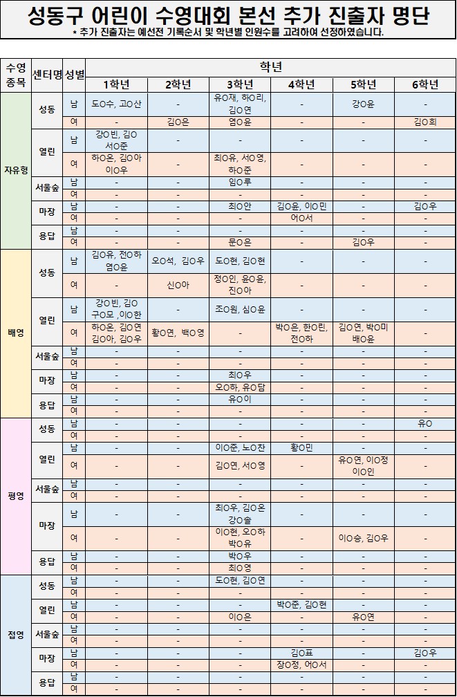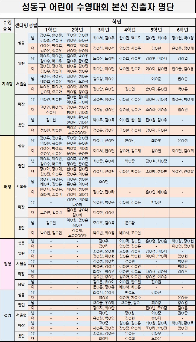 성동구 어린이 수영대회 본선 진출자 명단 작성자 관리자 등록일자 2023년 5월 22일 15시 8분 1초 조회 1,698 어린이 수영대회 본선 추가 진출자 명단.jpg [ Size : 201.1KB , Down : 1,947 ] 미리보기 다운로드 수영대회 진출자 명단.jpg [ Size : 312.82KB , Down : 1,579 ] 미리보기 다운로드 목록보기